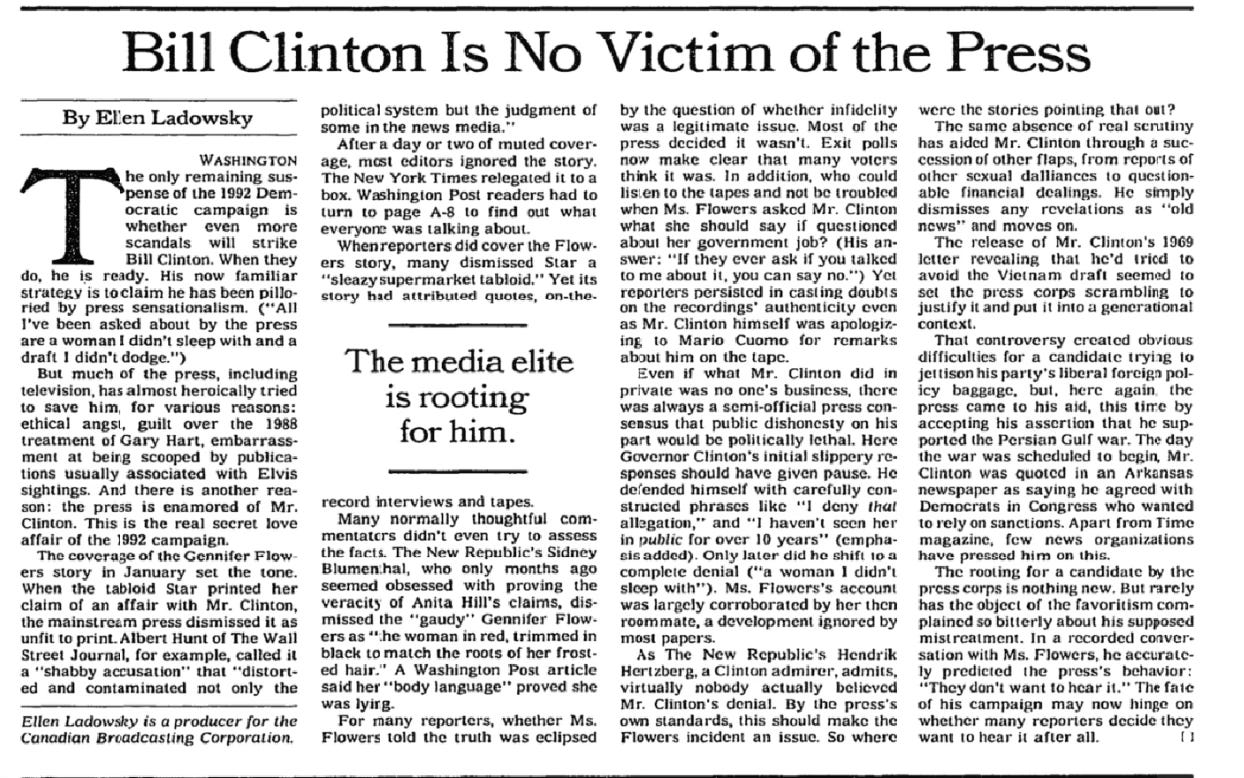 By 1992, there was no chance we were going to allow a few “bimbo eruptions” to take down our most promising candidate since JFK. Hillary Clinton was standing by her man. Once again, the New York Times was not afraid to offer a scathing dissent against the Democrat: