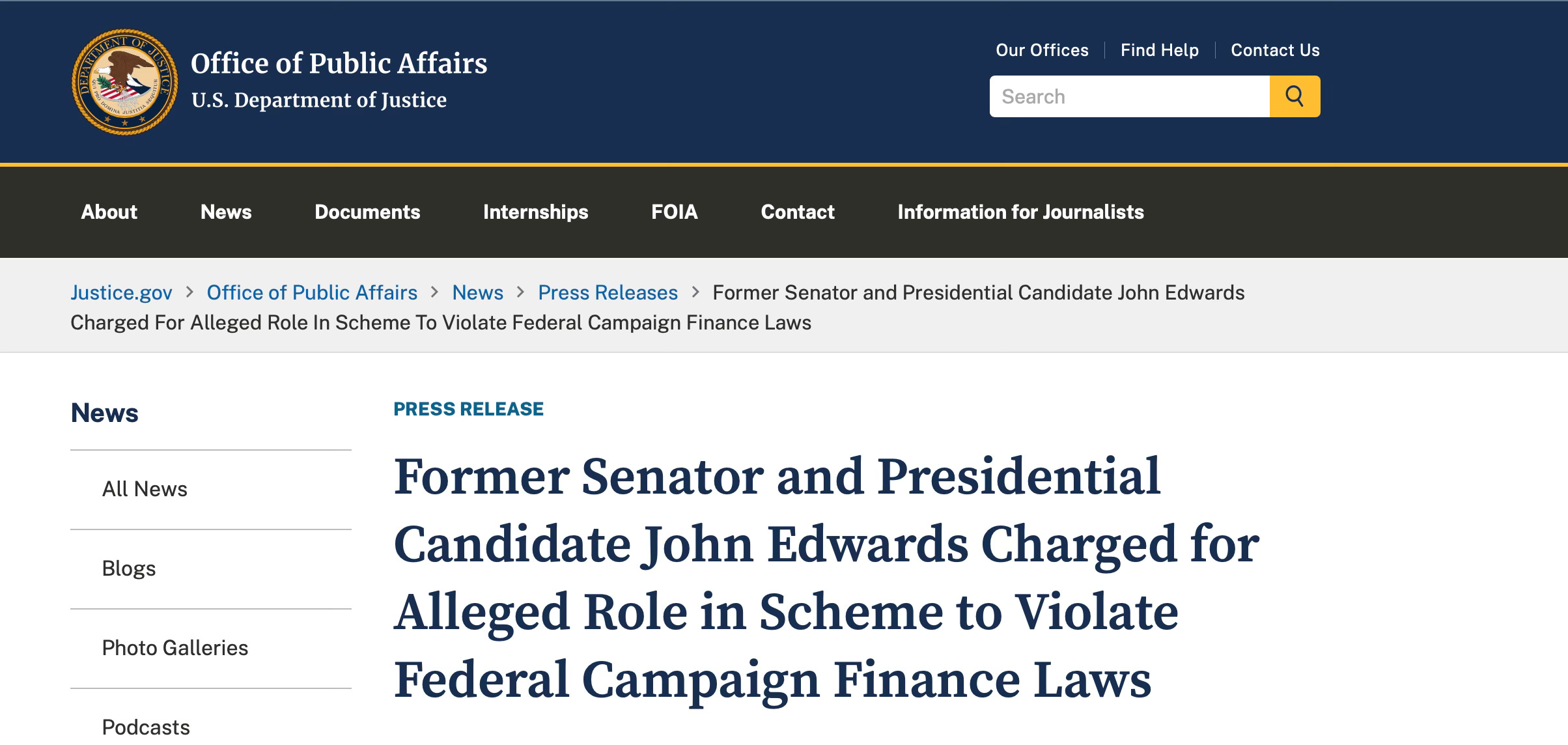 But the Edwards story kept getting worse, eventually forcing him to drop out of the race. But even then, Obama still considered him to run as his vice-present. But that fell apart when Edwards was charged by the DOJ for breaking campaign finance laws: