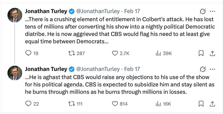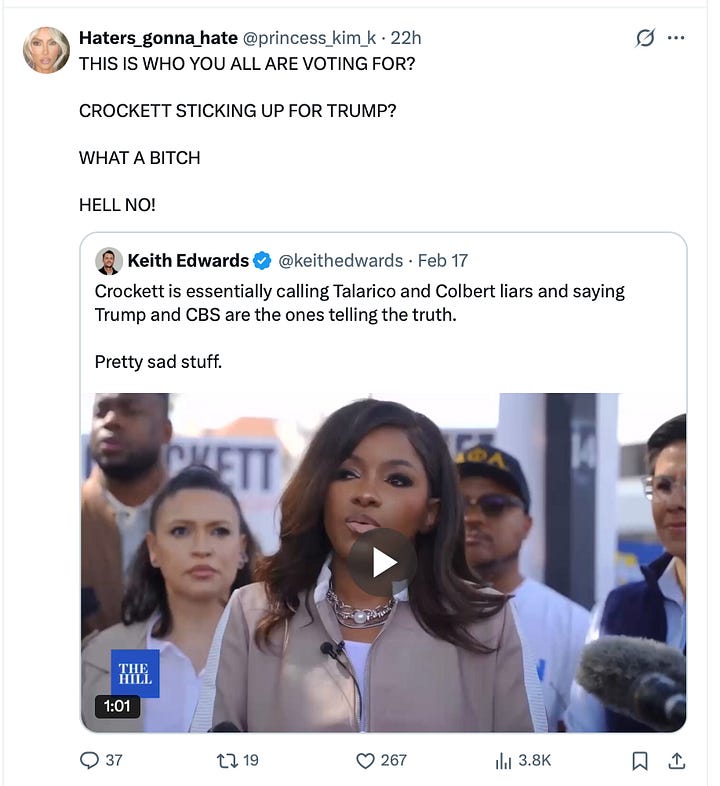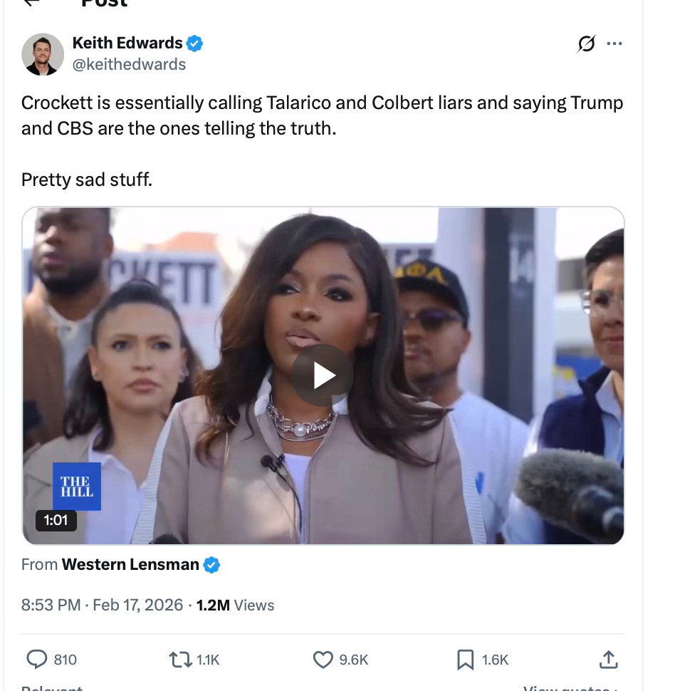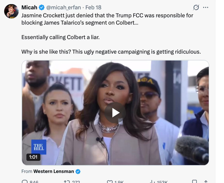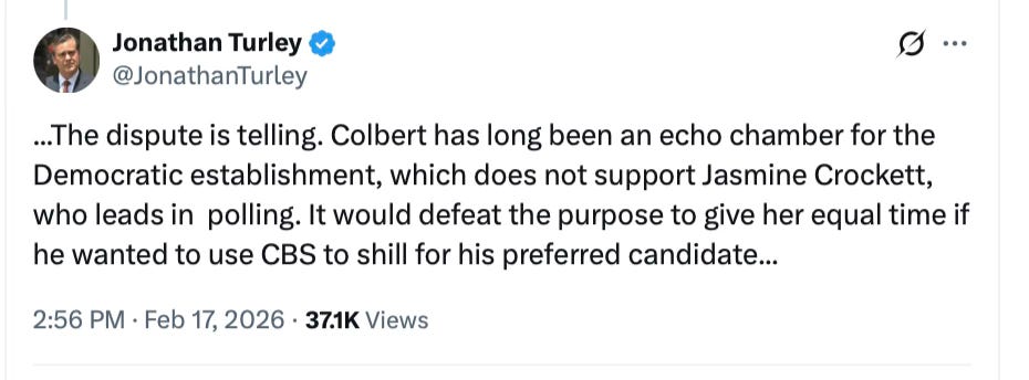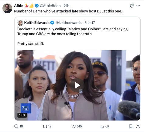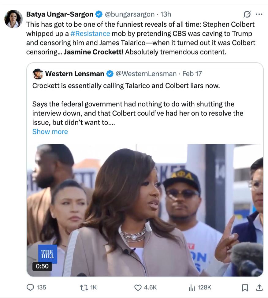 The “equal time” rule means Colbert would have only needed to put Jasmine Crockett on the air. They probably knew that, but they also knew that both Stephen Colbert and Jimmy Kimmel saw big boosts in ratings when it was perceived that they had entered a war with Trump. Why not use the same strategy to shine a light on the guy they believe can win?