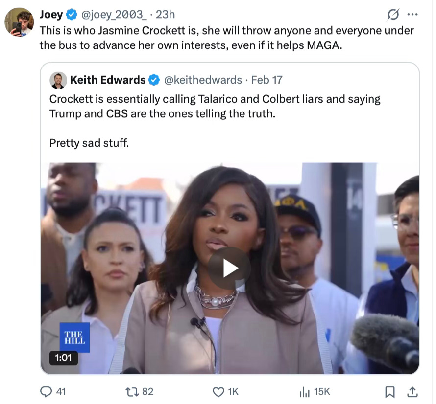 Jasmine Crockett is learning the hard way that the Democrats are like the mafia. They’ll throw you under the bus when it's convenient, no matter what the people want.