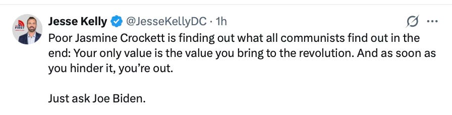 Our politicians are just tools of the parties. Use the tool then discard when not so useful. I would feel bad for Jasmine Crockett, almost, but that's the party she joined. Plus, she just has not earned much sympathy.