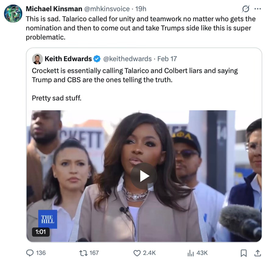The Democrats will continue to push the lie that any of this had anything to do with Trump. It didn’t. It was the Democrats attempting to elevate their preferred candidate. That should be a major scandal, not so much because they sidelined Crockett in a clumsy, obvious way, but because they tried to lay it at Trump's feet.