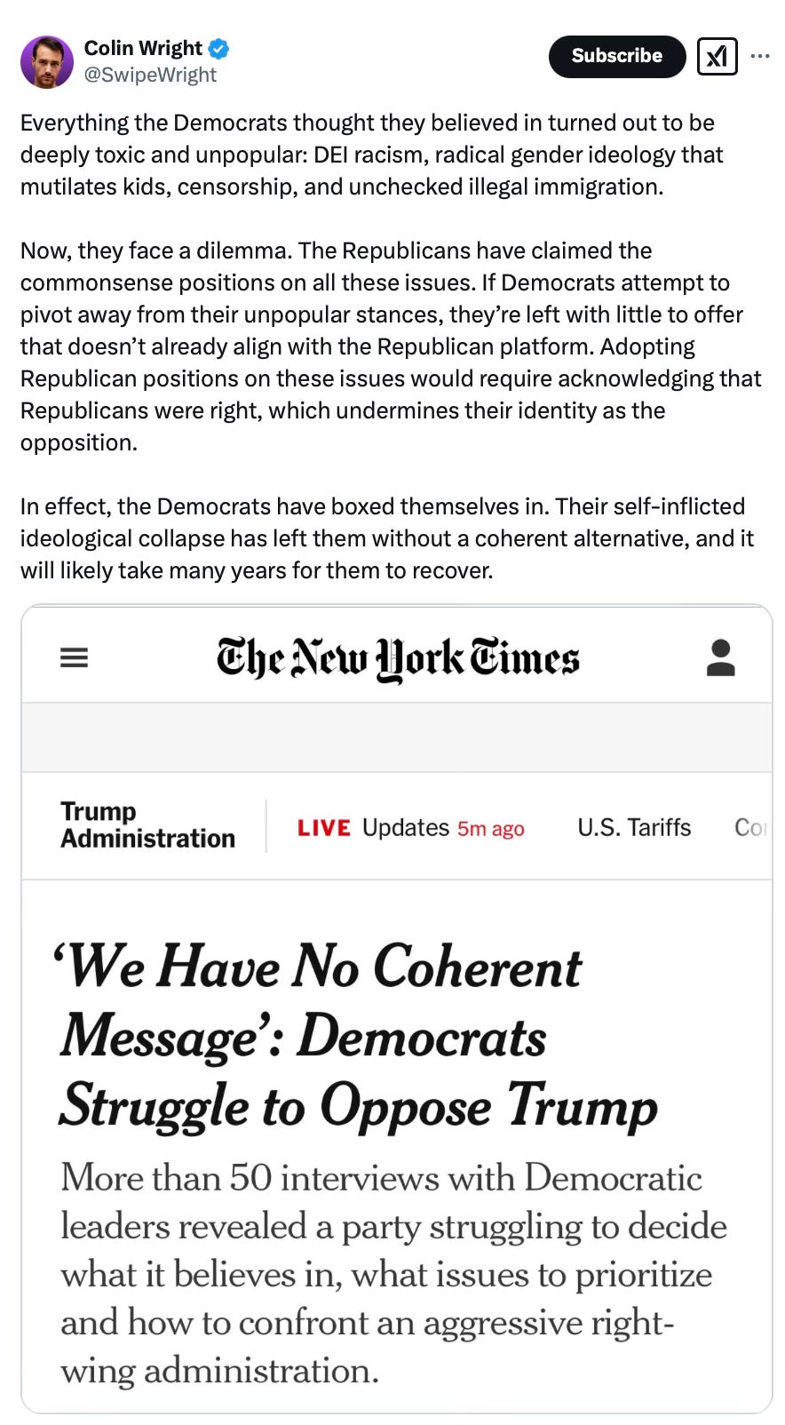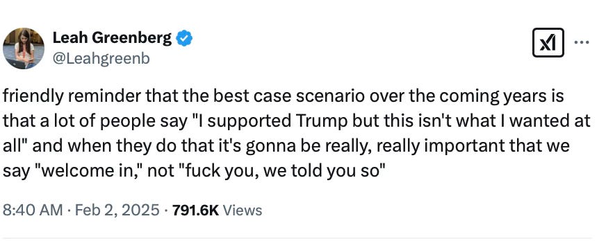 I’ve seen tweets by people who are hoping their ongoing hysteria about Trump’s first ten days will send people like me running back into their arms. But the problem has never been Trump. The problem has always been them, what they did to this country, what they did to the party, what they did to themselves.