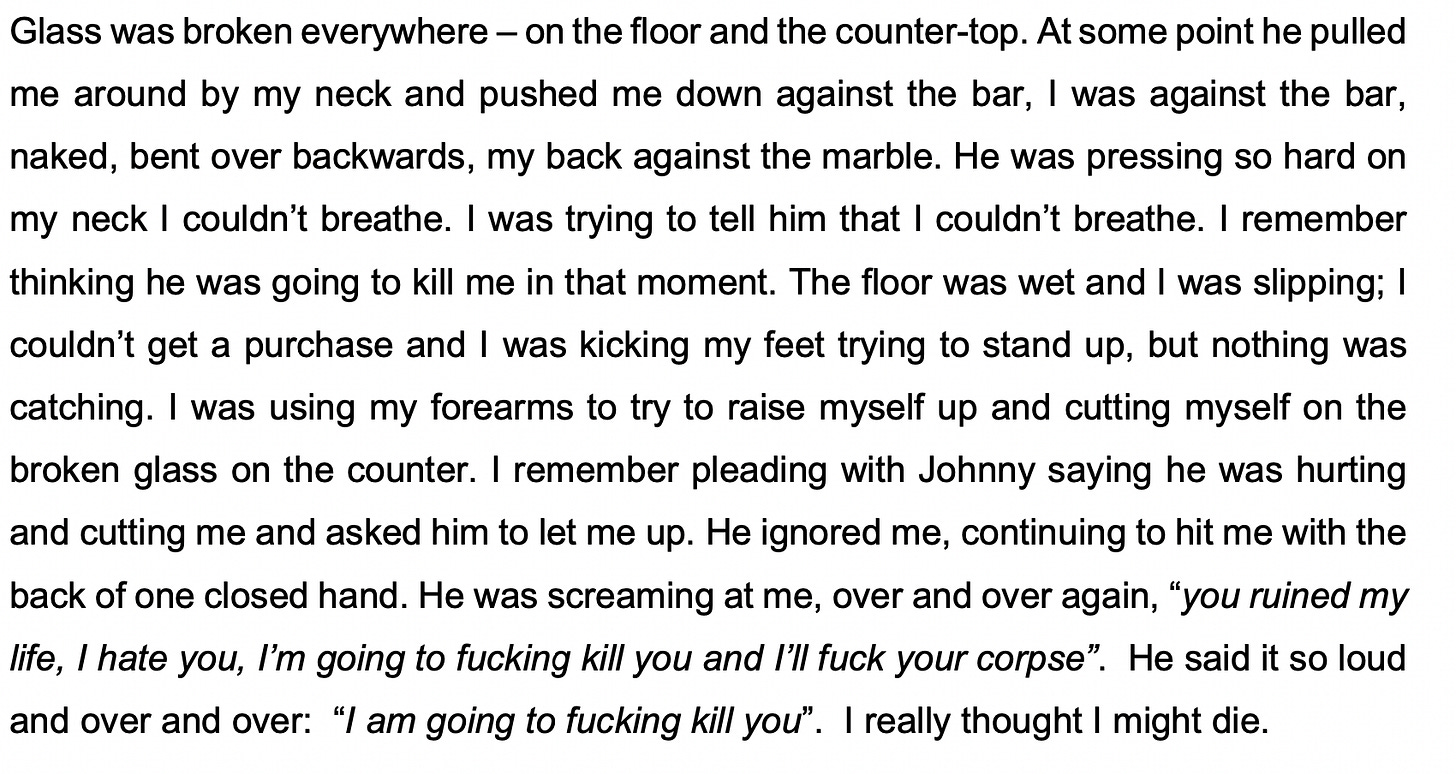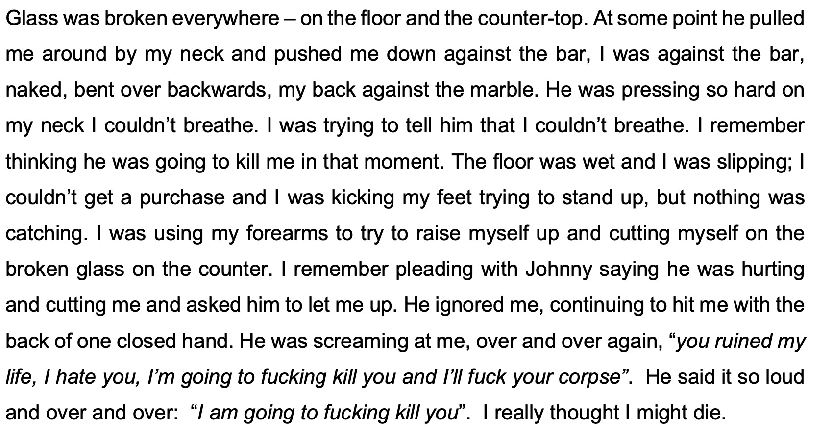 Don't see him anymore. It was even more. It wasn't him. It was black. My life he was but it was black. I couldn't see him. And he was looking at me and I was trying to get through to him. I was trying to say to him in some way that it was me I was trying to get through to Johnny and I couldn't see it my head was bashing against the back of the bar and I couldn't breathe and I remember trying to get up on it was slipping on the glass, my feet were slipping my arms were slipping on the countertop I remember just trying to get up so I could breathe, so I could tell him that he was really hurting me. I didn't think he knew what he was doing….I couldn't breathe. I couldn't get through to him. I couldn't I couldn't get up, but I couldn't get up, and I don't know how that ended I don't know. I don't know how…I don't know what happened next remember it was bent over backwards on the bar meaning my chest was up I was staring at the blue lights. My chest, my back was on the counter and I thought he was punching me…I felt this pressure…I felt this pressure his arm, I could feel his arm moving, it looked like he was punching me you could just feel this pressure …hitting didn't feel pain, which is a pressure on my pubic bone.”
