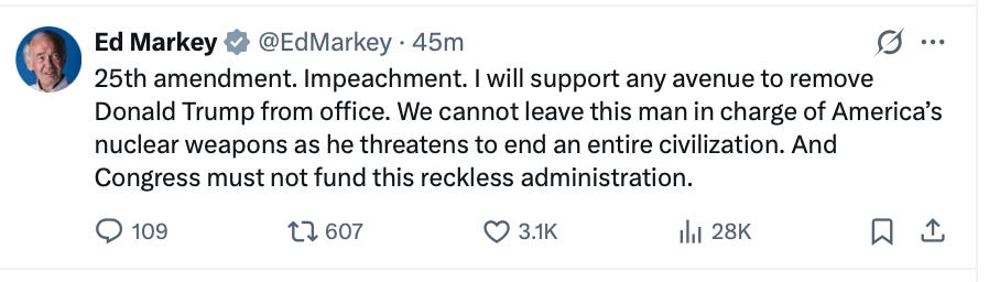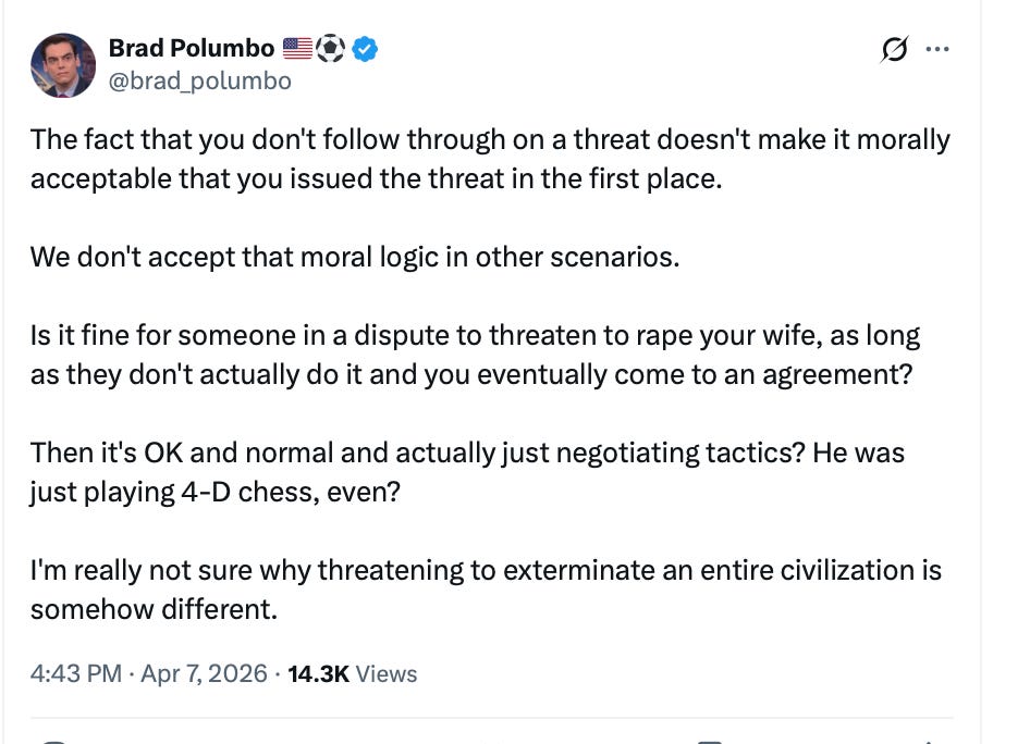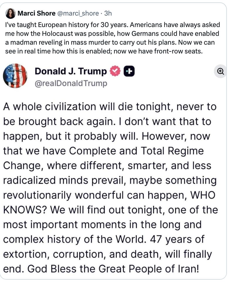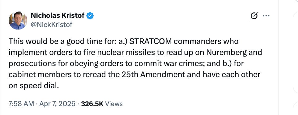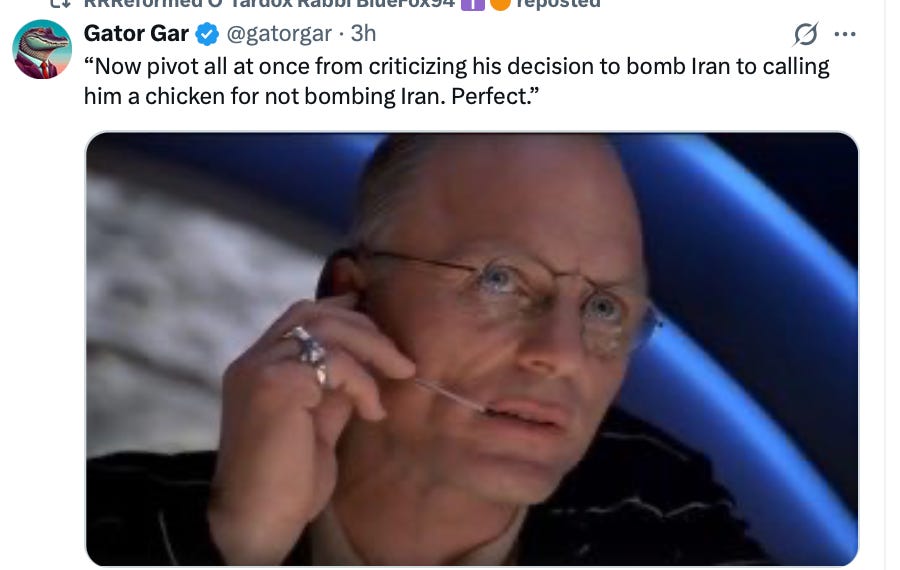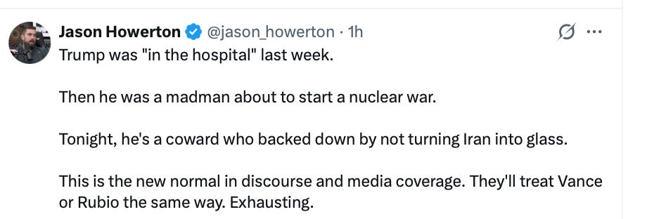 It was Gerard Baker and Chris Cuomo. It was the Democrats and many of the newly anti-Trump MAGA Right. The tweets were coming fast and furiously as the “for you” algorithm dumped more into everyone’s feed. The panic was everywhere. This was finally it! Trump was going to drop a nuke! He was going to wipe out an entire civilization!