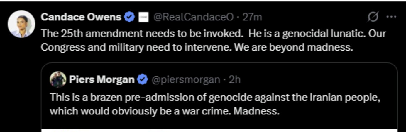 But shockingly, because Israel is involved, the same level of mass panic was coming from the Right too. They were all ready to force Trump out of office.