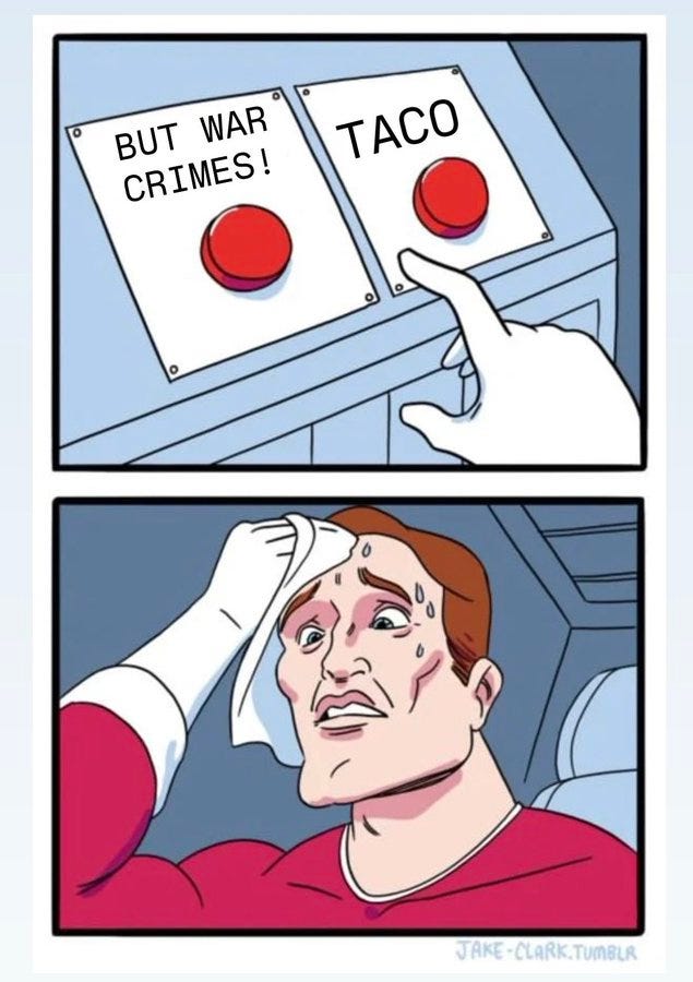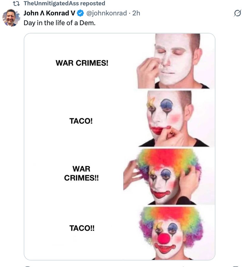 Instantly, the Democrats and the disgraced podcasters tried to save face by flipping it back to Trump, saying he lost the war to Iran and that he was “TACO” (Trump Always Chickens Out).