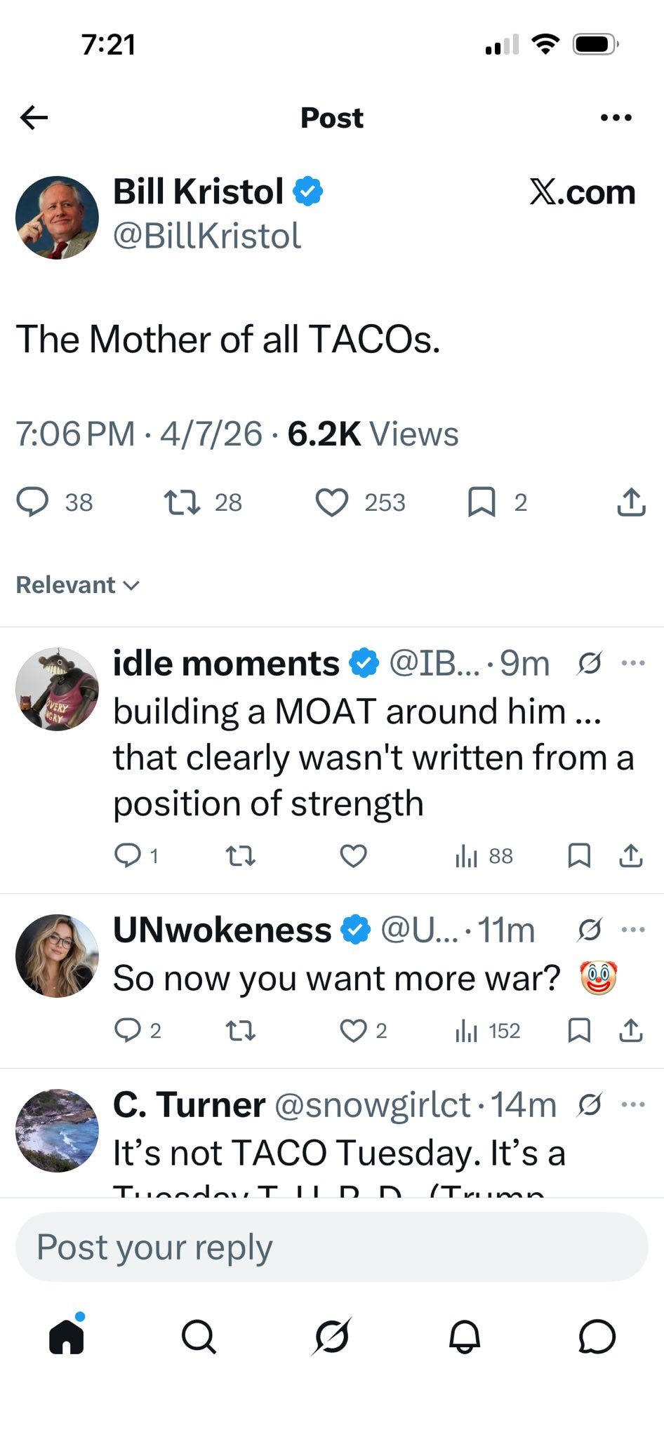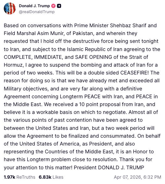 It seems that this pattern plays out often, and yet, they never seem to stop themselves from reaching the mass hysteria flashpoint. And of course, as expected, a Deus ex Machina in the form of a Truth Social post by Trump announcing a two-week ceasefire.