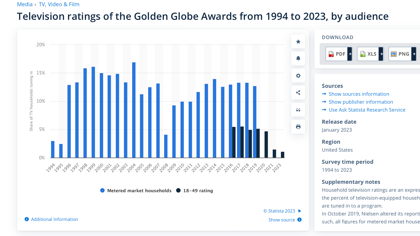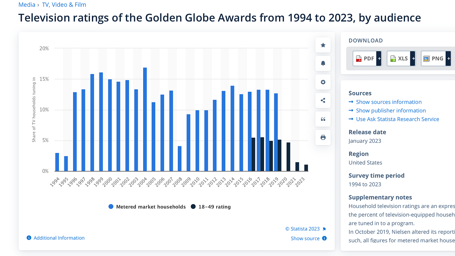 Unlike the Oscars and the SAG Awards, the Golden Globes hadn’t yet become grief porn for Democrats mad at Trump. Ricky Gervais was their host in 2020, and he called them out on their hypocrisy. His video has more views on Youtube than most of these awards shows combined for the past five years. That would have been the only way for the Golden Globes to boost their ratings; give people what they really want - someone to take the piss out of the sanctimonious, self-congratulatory, hypocritical industry.