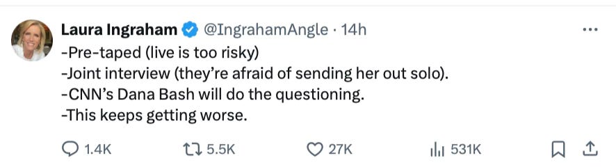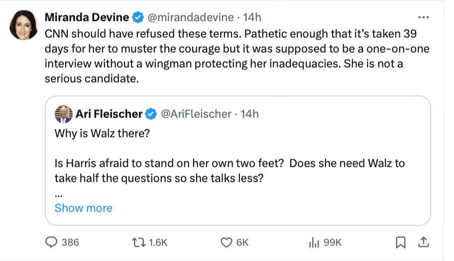Kamala Harris is, right now, a heartbeat away from the presidency. That is even more terrifying than her becoming president. If she can’t even face Dana Bash alone, she certainly can’t be Commander in Chief. Not now, not ever.
