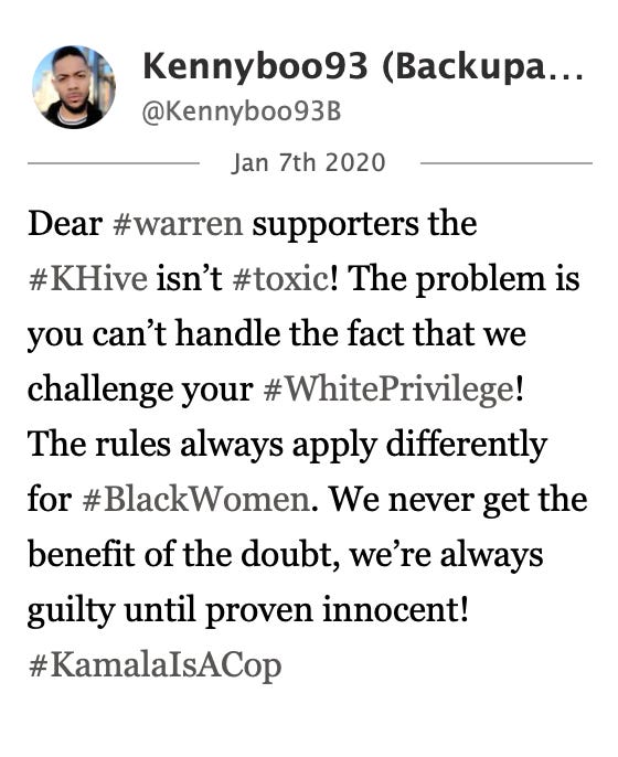 A clique of Harris supporters online was dubbed the #KHive. They were notoriously vicious, especially to Warren supporters. But since no one online can ever speak the truth about anything, most people were bullied into silence or else forced to play along.