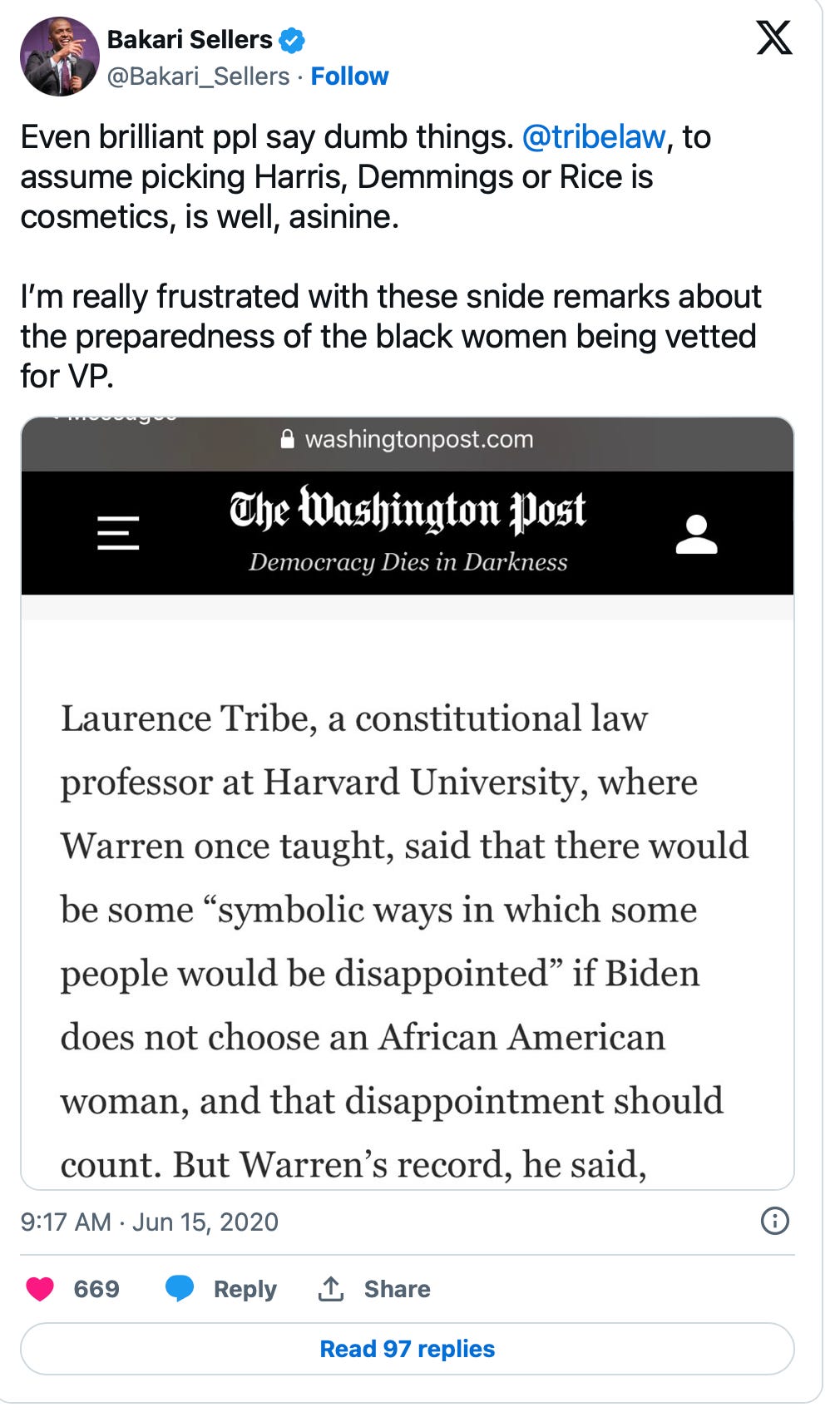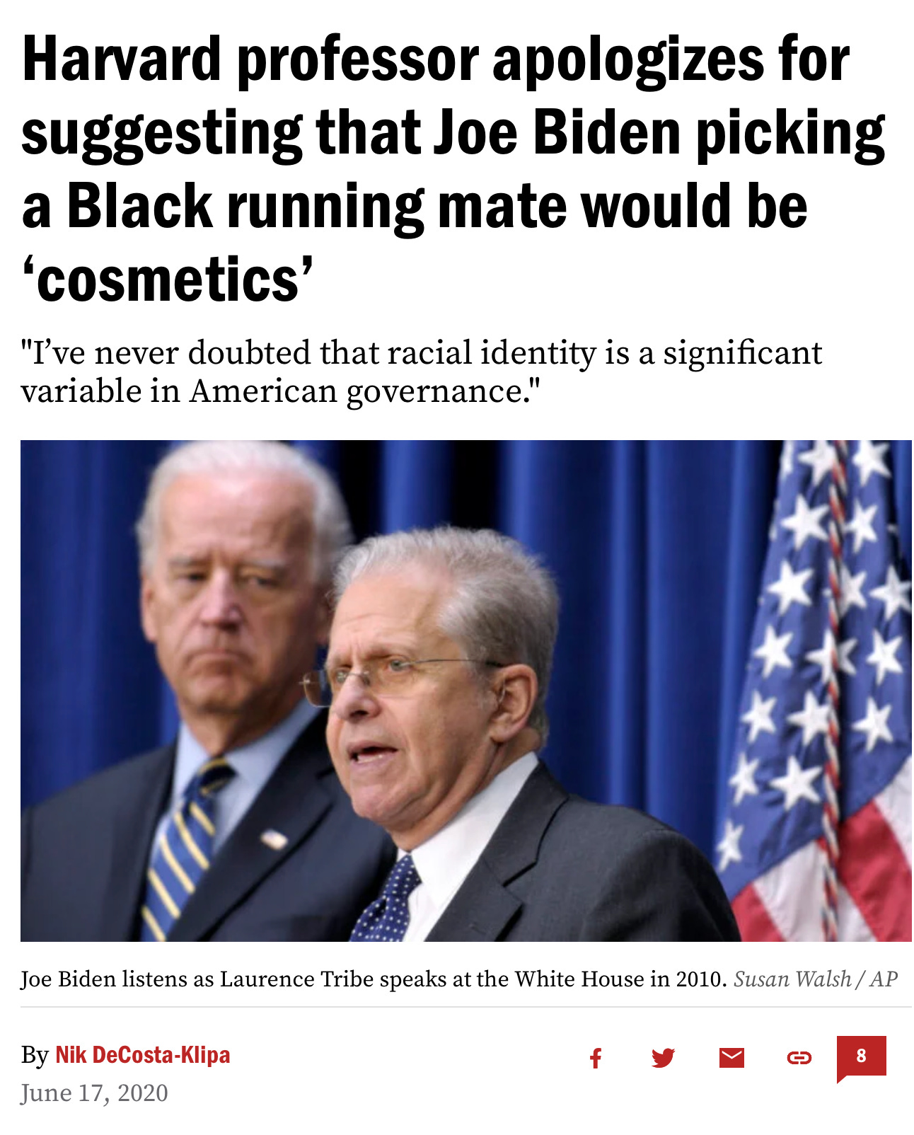 The Warren supporters would not give in so easily. Laurence Tribe stepped in it when he joined 100 others who signed a letter urging Biden to choose Warren as his running-mate, suggesting he should not make such a serious decision for “cosmetic” reasons.
