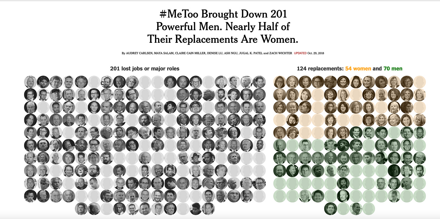 I was in the eye of the hurricane the #metoo movement hit. Trump had written off the Access Hollywood tape as locker room talk but the New York Times wrote a piece collecting confessions by professional women of sexual assault in the story, “For Many Women, Trump’s ‘Locker Room Talk’ Brings Memories of Abuse.”