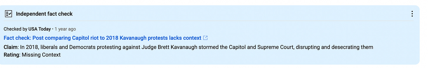 As if to illustrate just how dystopian our country has become at the hands of the left, Youtube’s “fact check” on a simple search for “Kavanaugh protests”: