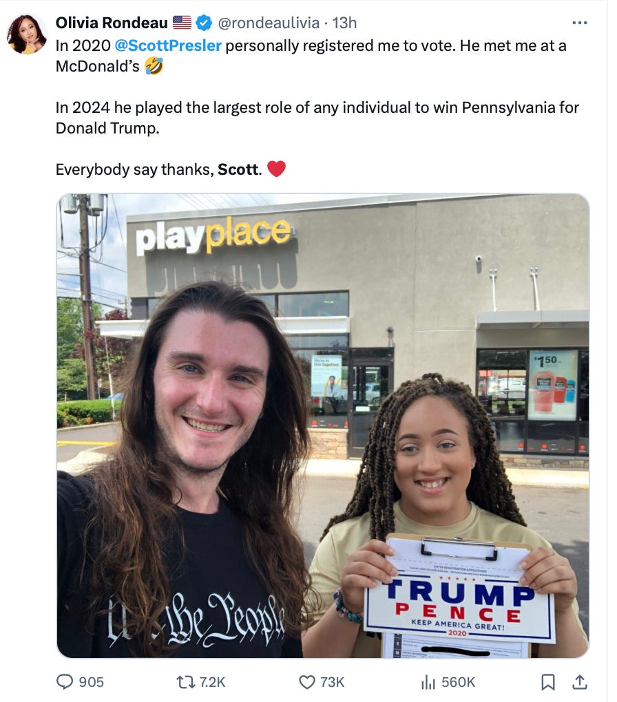 His loyal supporters, a grass roots movement that kept Steve Bannon’s “War Room” going day in and day out even when he was in prison. They all donated to buy Scott Presler an SUV so he could move to Pennsylvania and help flip the state.