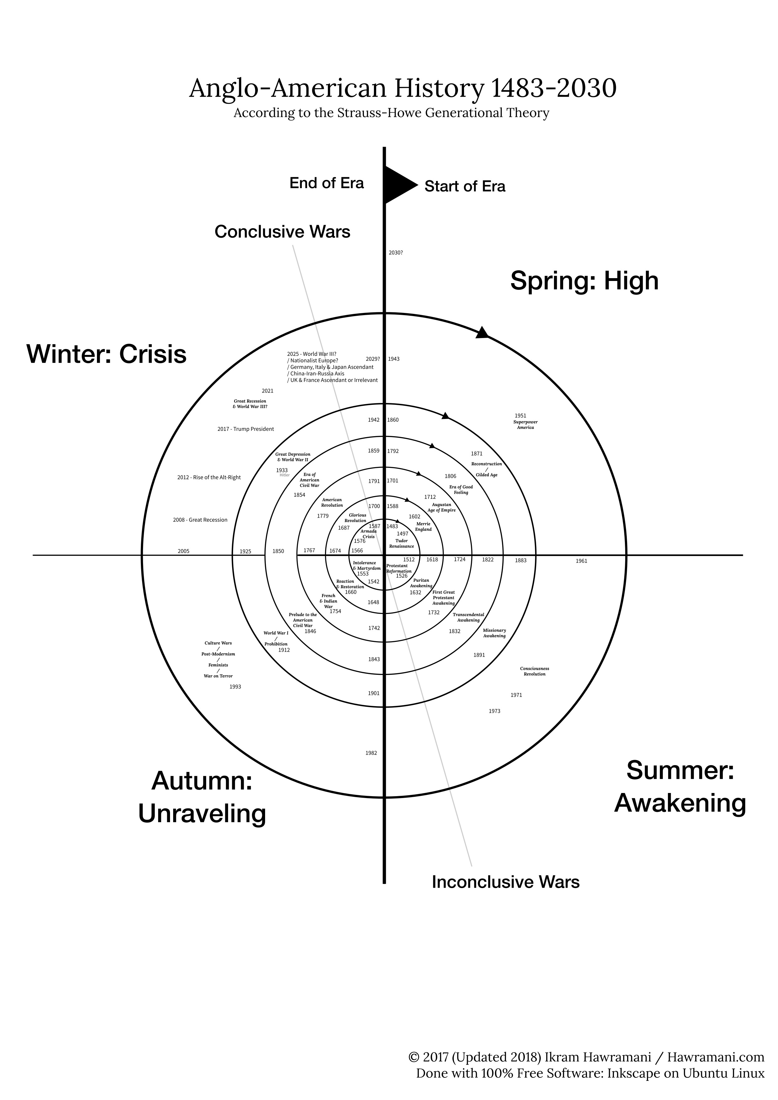 This graphic found on the internet does not include other key movements that arose since 2008 - like Occupy Wall Street, the Tea Party and Black Lives Matter. The alt-right, as such, has different meanings for different people. The far right can apply to people like Nigel Farage in the UK or France’s Marine Le Pen. The alt-right are generally thought to be racist, misogynist trolls. One is reaching for power in government and the other is trying to disrupt it. These are very different things, although Trump appealed to both. But here is the Fourth Turning theory, more or less: