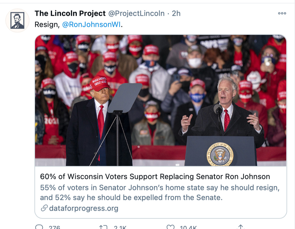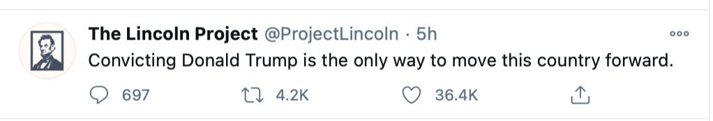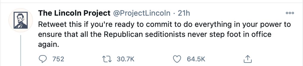 With a trial for impeachment (Trump’s second) and a Senate vote upcoming, the Lincoln Project are threatening Ted Cruz, who was one of a few Senators who were willing to hold the line so Trump could make his case in congress about voter irregularities - which is his constitutional right, along with the hundreds of thousands of supporters who showed up in DC that day. Wilson has been heard in interviews calling them “Jim Crow racism” - which is odd, considering Trump’s reach with black voters. That is how he is positioning Trump’s fight — racism. And you know, if there is one thing on the left that scares us into doing anything - it’s the charge of racism, even though it is debatable that Trump’s desire to recount had anything to do with that. Although it’s certainly possible that it reads that way, what with the focus on Philadelphia and Georgia.