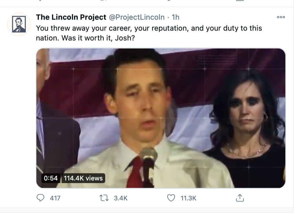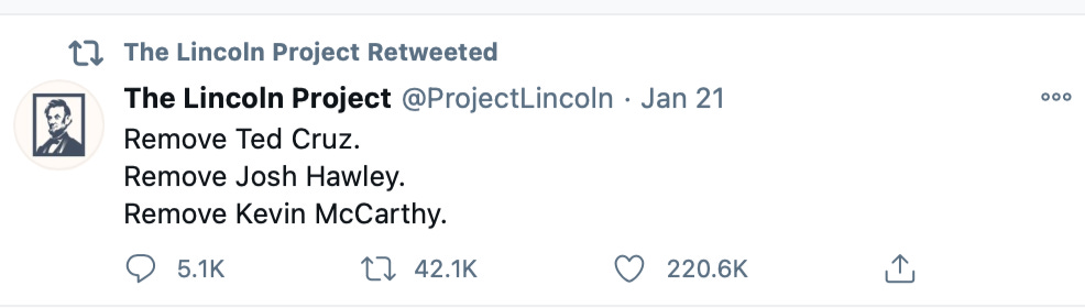 What worries me more is how easily the Lincoln Project is slipping into full blown witch hunt mode, which is only going to turn people like Ted Cruz into martyrs and make them look bad. They’d be better off using their millions raised to find better candidates for the Conservatives or even the Moderates. But they are like a dog with a bone - they’re not going to let it go.