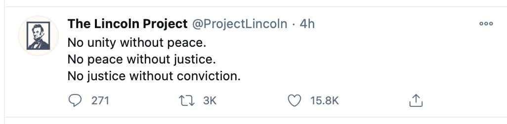 I do still admire the Lincoln Project, even if they’ve all pretty much unfollowed me on Twitter (not that I blame them) but I think by now they are doing more harm than good by keeping the flames of rage on fire. Can’t we just find a way to unite and move on?