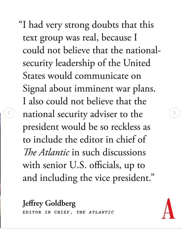 I don’t have much to say about the drama surrounding The Atlantic’s Jeffrey Goldberg's addition to a group chat where members of Trump’s Cabinet were discussing sensitive war information. I’m sure there will be much smarter people discussing it today. The Democrats are howling like a pack of coyotes cornering a frightened alley cat.