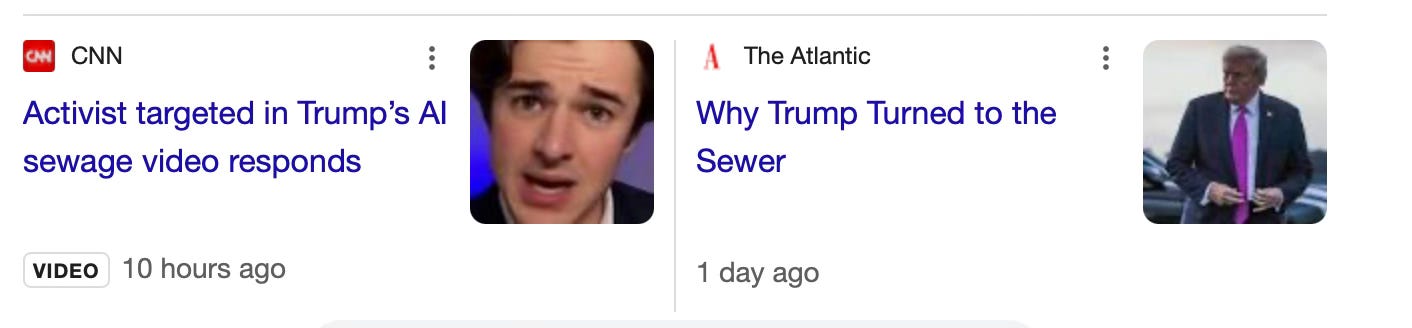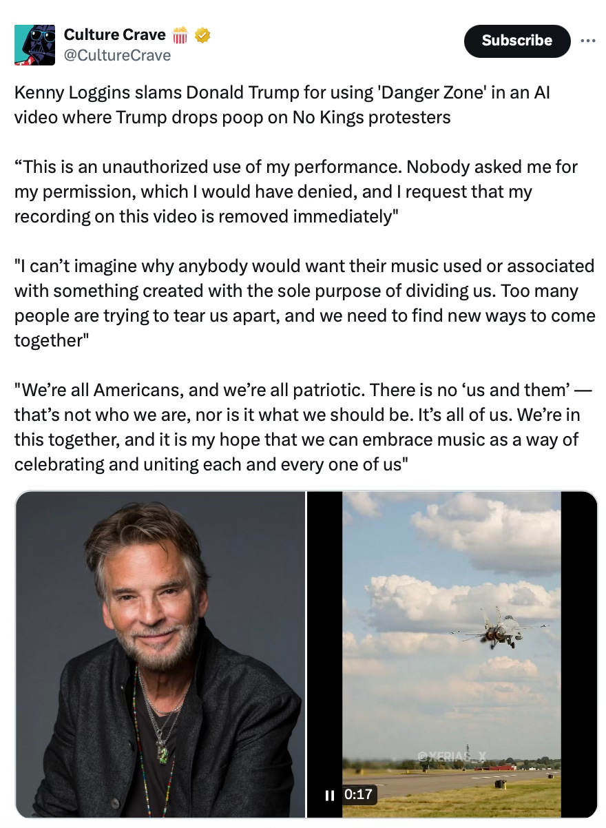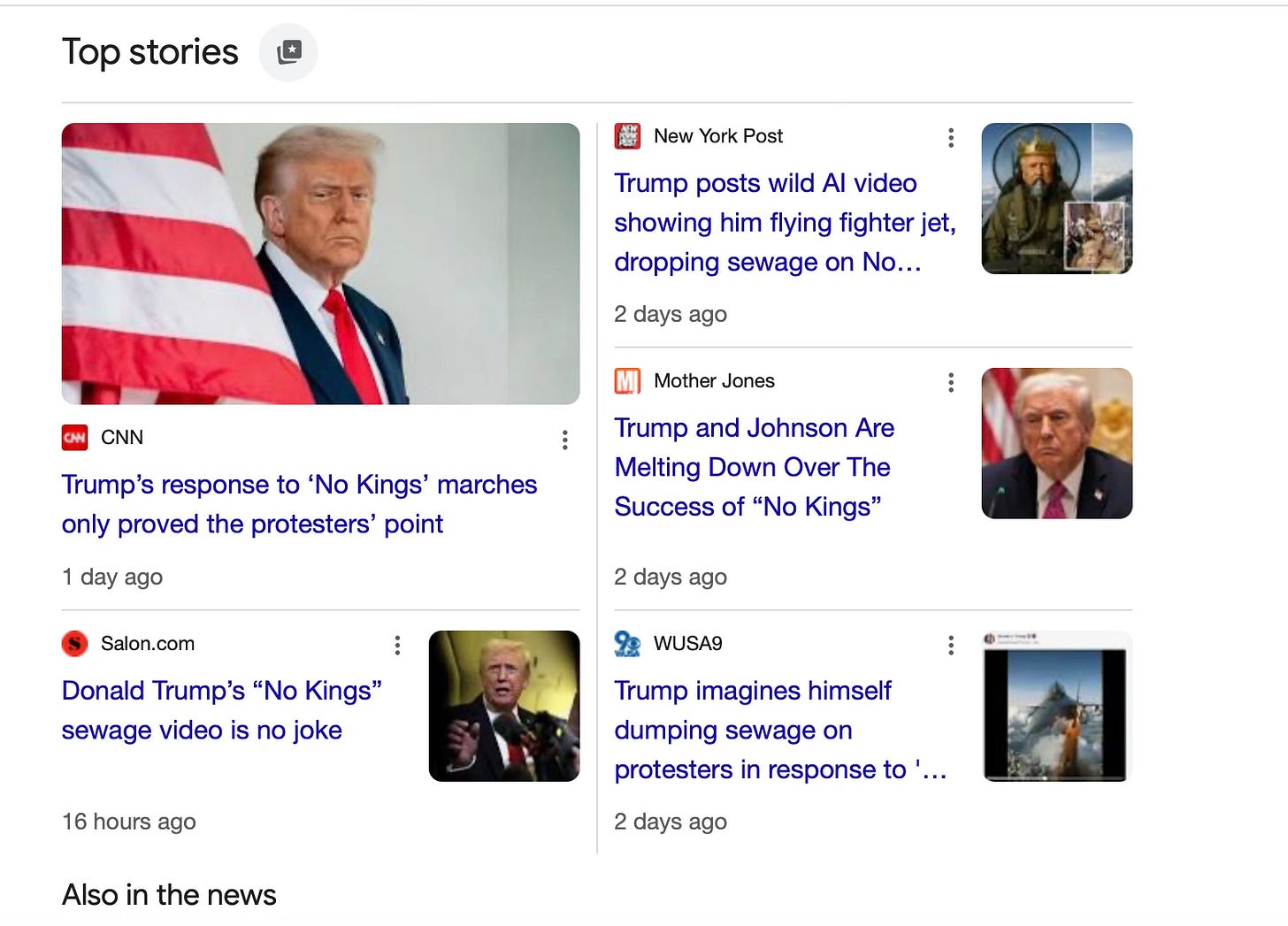 Or it’s a Top Gun parody with Trump dumping sewage on Harry Sisson and the No Kings protest.
