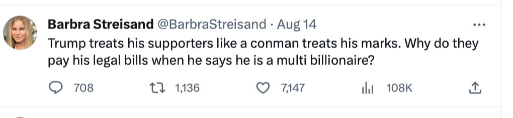 Money drives politics; everyone knows that. But when Trump’s small money donors chipped in and raised $7 million almost overnight for Trump’s defense, it was proof enough of the widespread affection so many people have for Trump, and it was threatening for people who have all the money and believe that entitles them to all of the power. Well guess what? It doesn’t.