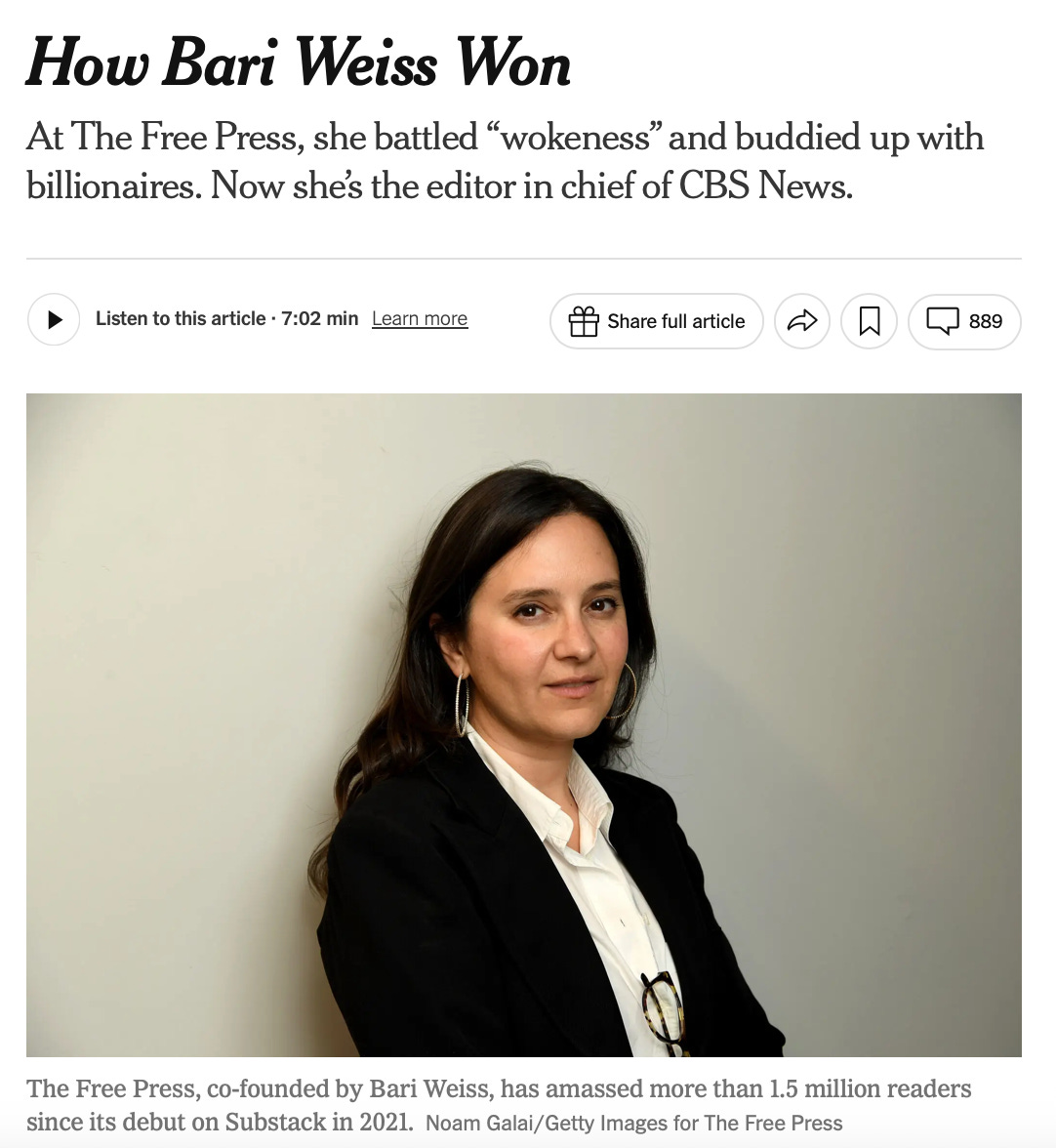That’s the way Jessica Testa believes Bari Weiss “won,” by defeating “so-called wokeness,” and that, along with her billionaire pals, landed her a job at CBS News. That is what I call an act of bad journalism, Ms. Testa, because you left out the best part of the story: the truth.