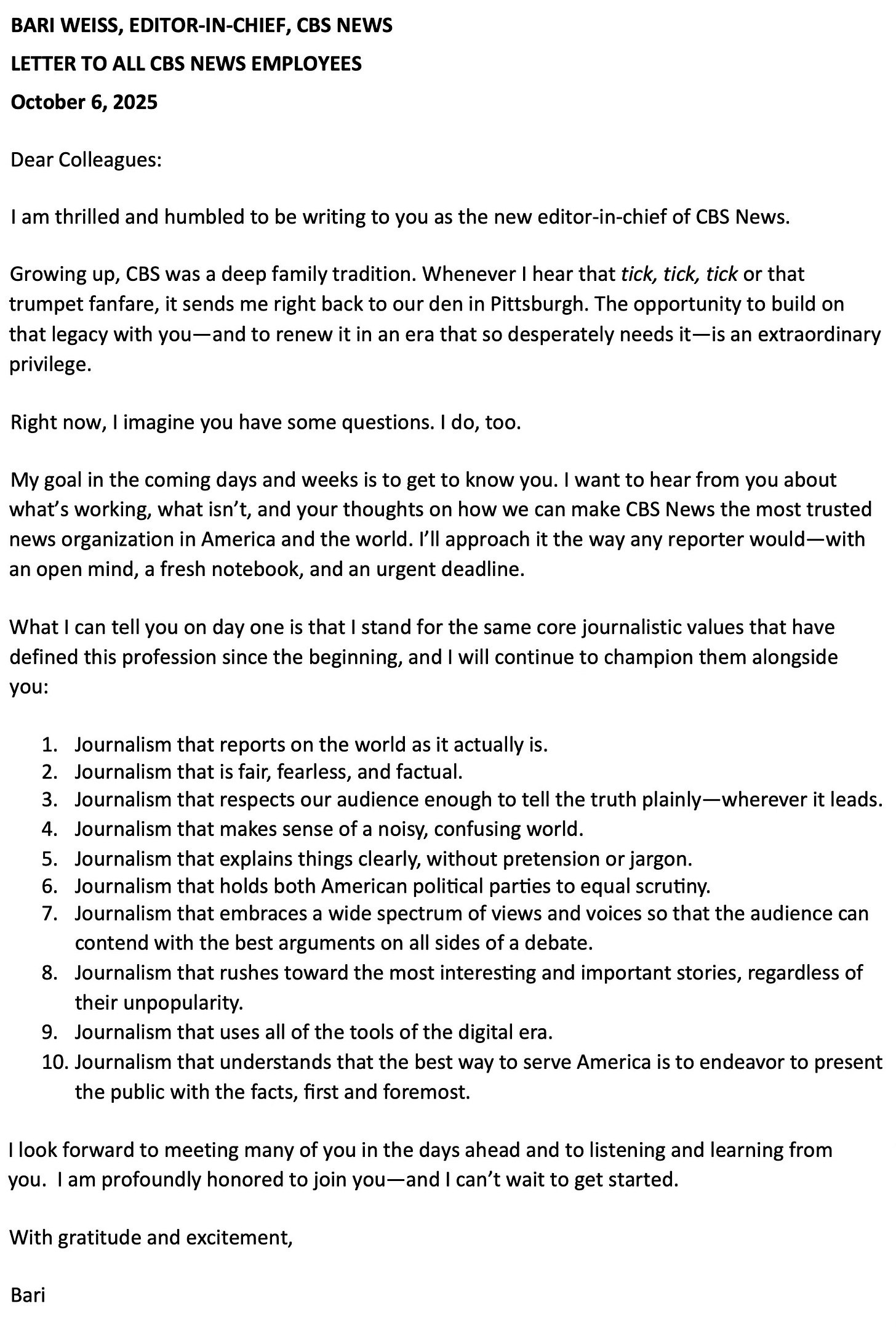 Do I always read the Free Press? No. Do I agree with all of it? No. At least I read it more often than I read the New York Times because every so often, they post a story that is fearless and of interest to me. Her letter to the staffers at CBS went as follows: