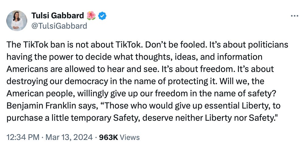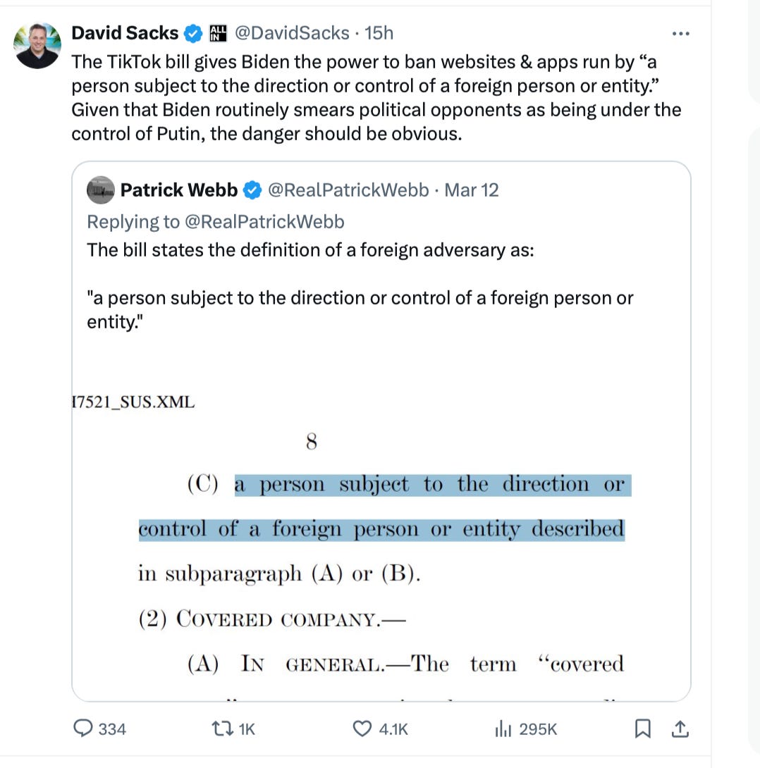 There are only two possibilities for the Republicans to go along with a TikTok ban. The first, they’re Luddites who don’t understand the free speech issue involved in silencing hundreds of millions of Americans. Second, they were played by the Democrats.