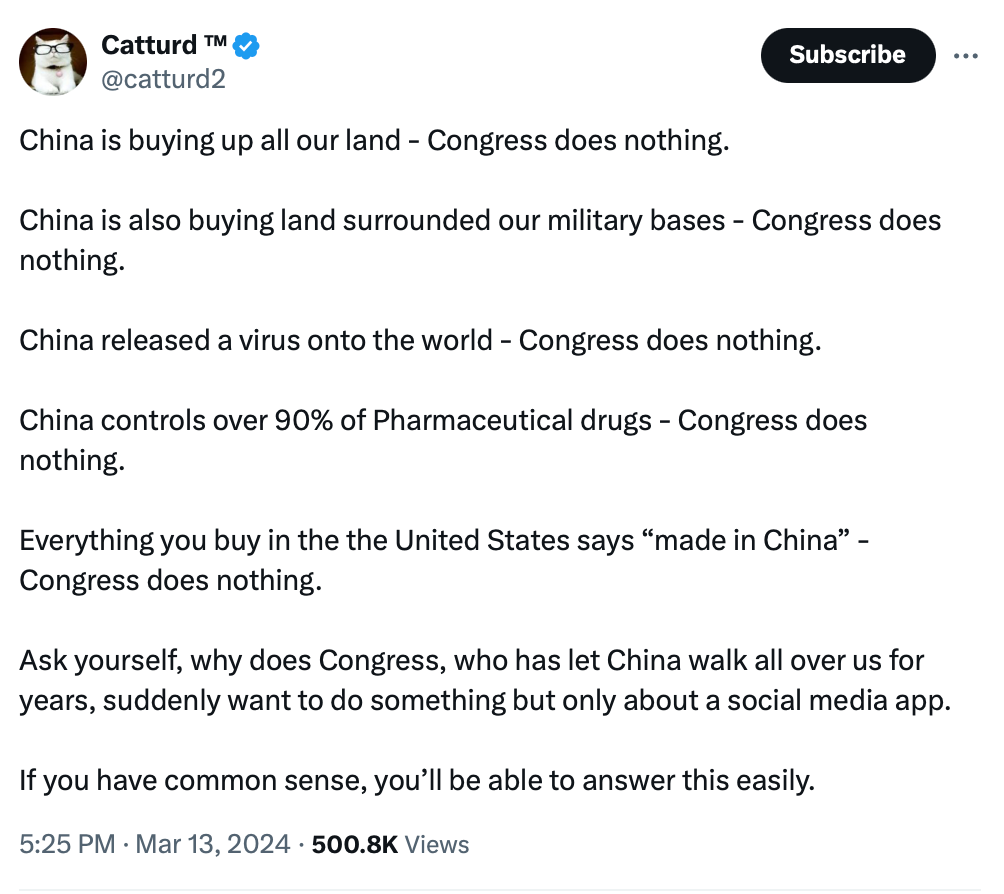 The site that sells the cheapest of cheap crap called TEMU advertised during the Super Bowl, and we’re supposed to believe they’ve all just suddenly turned on China? Yeah, no.