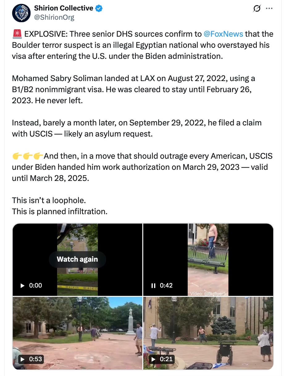 The media is using careful language to describe what just happened in Colorado. According to the DHS, an illegal migrant overstayed his visa and threw Molotov cocktails at peaceful protesters in Boulder while shouting “Free Palestine.”