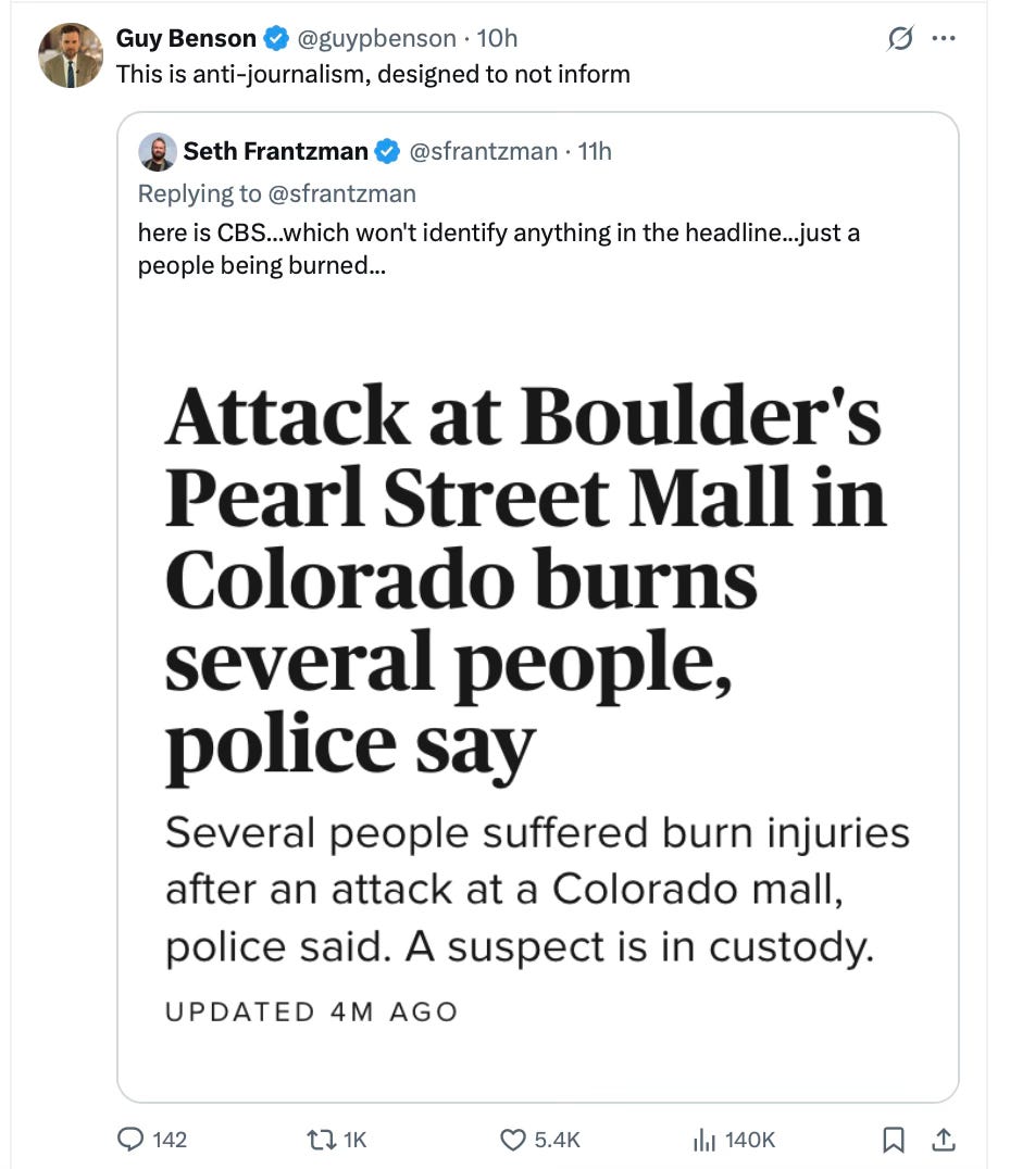 The media’s hesitation in calling out terrorism, even the literal definition of it that just occurred in Boulder, speaks volumes about the fanatics that have captured nearly all of them. They know many of their readers will call them racists the minute they use that word.