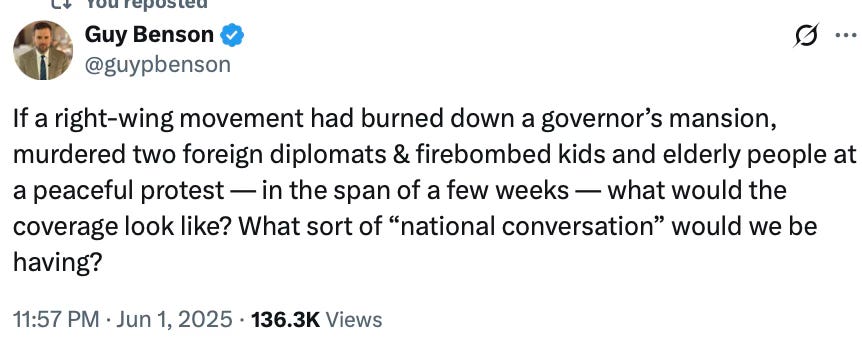 What’s funny about it is how comfortable all of them have been for ten years now, but especially after January 6th, calling MAGA “domestic extremists” and terrorists. Imagine if Trump supporters had done what these “Free Palestine” extremists did.