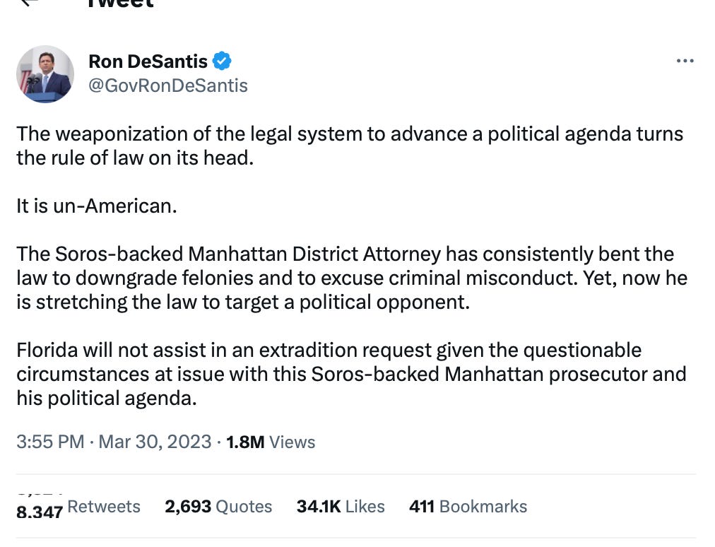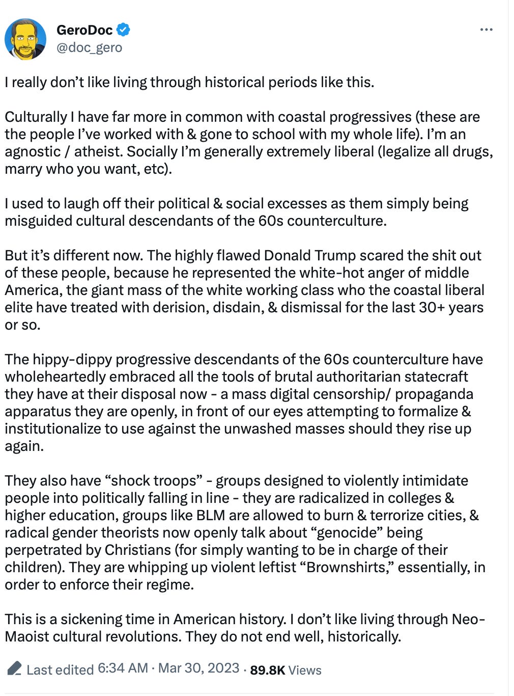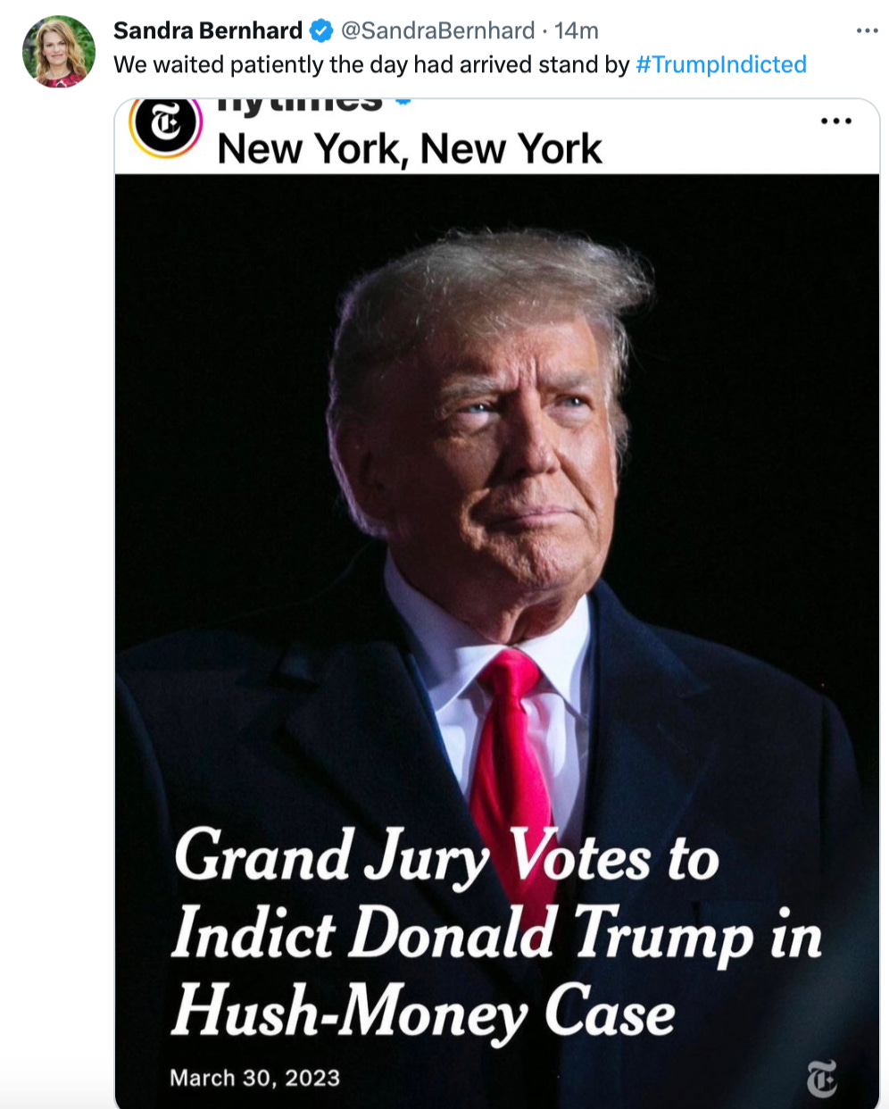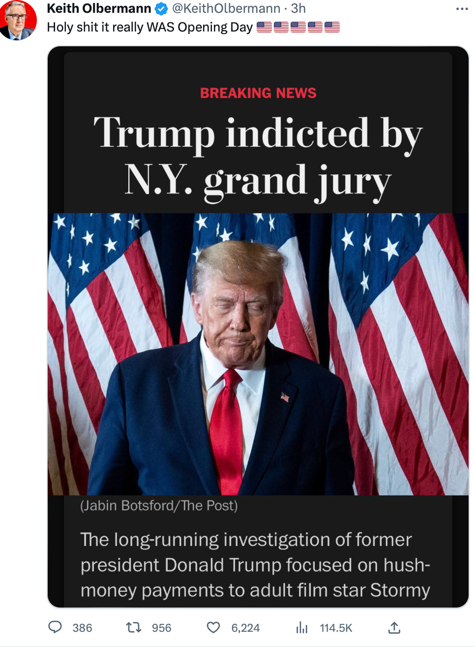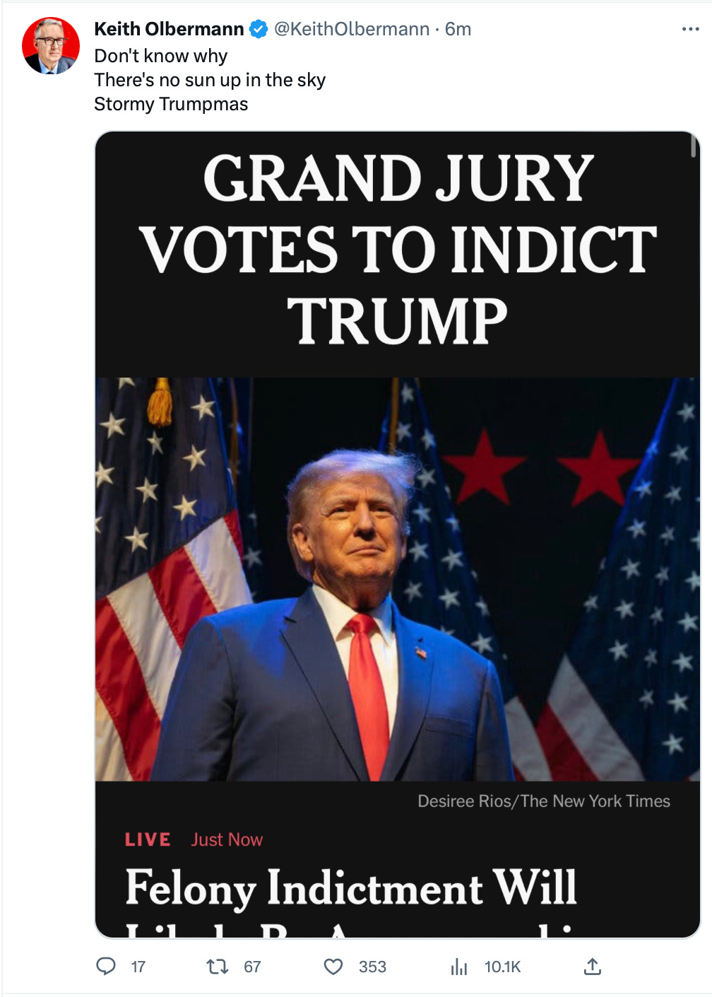 They’re apparently charging Trump with 34 counts of things that have nothing whatsoever to do with their main complaints against him: threat to Democracy, racist, extremist, etc. This will be limp and procedural and it will embarrass all involved. Just don’t expect Twitter or the media to ever admit it.