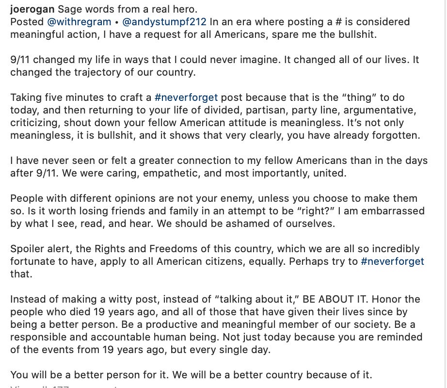On a day like today, 9/11, I don’t like seeing partisan warfare on twitter. I don’t like seeing anger and ugliness from my friends who feel justified in doing it because they believe they know the victim, they know the perpetrator and they are the avenger and doesn’t make them good people? I don’t know if dehumanizing other people ever makes anyone a good person. I can’t think of a single instance where it does. Rather, the people I think of as good are those who do not and would never engage in dehumanization: Jane Goodall, Andrew Yang, Barack Obama.