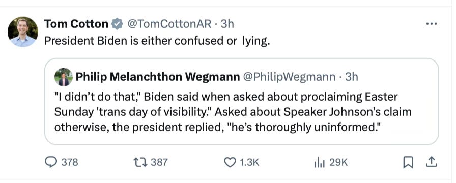 Technically, Biden is right. He didn’t declare Easter Sunday “Transgender Day of Visibility.” He didn’t invent it. It happened to coincide with Easter Sunday. They sent out his press release with his proclamation on it.