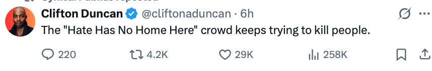 When they are confronted with the reality of real-world violence, and they must reckon with who and what they have become, they go on autopilot, make their canned statements about generic political violence, but never atone for anything they’ve done to bring us to this point - all of them are culpable - the Democrats, the Never Trumpers, and the legacy media.