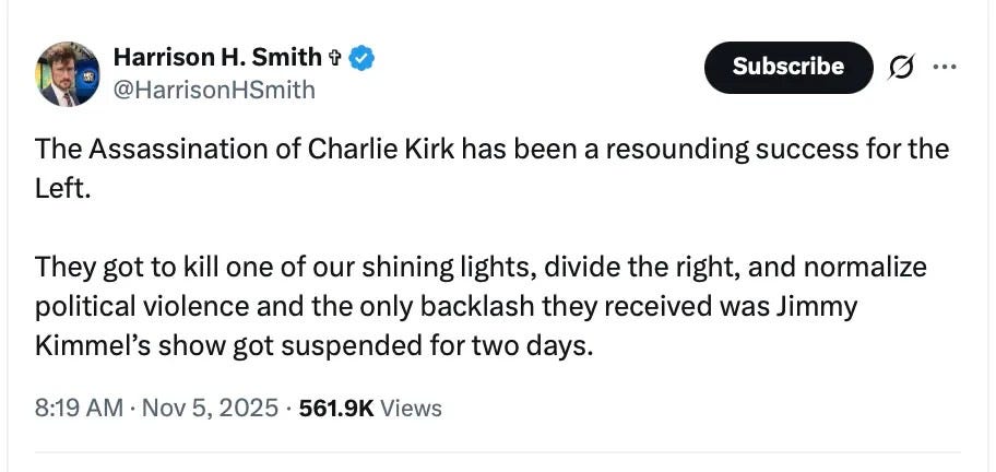 They never absorbed that loss, however, except in the way that it made them meaner, angrier, and more willing to blow through norms and abandon what remained of their humanity to chase victory by any means necessary. That would include spending hundreds of millions on Prop 50. It would include celebrating the murder of Charlie Kirk and fantasizing about Trump’s imminent death.