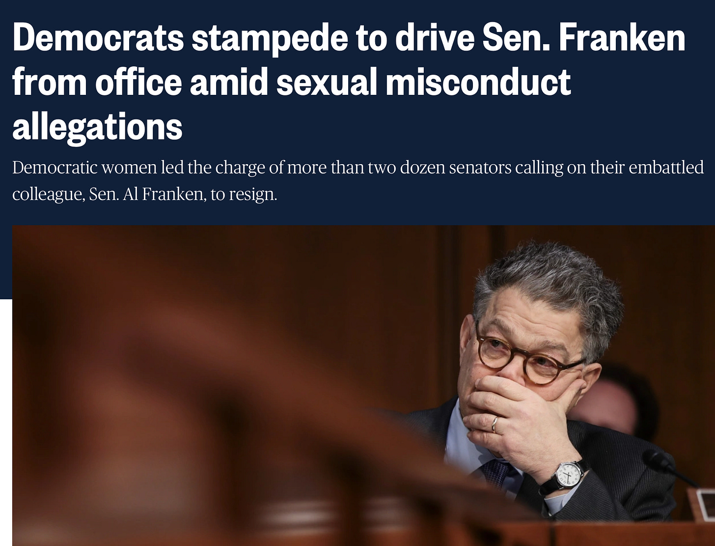 One by one, the high-profile senators joined the pressure campaign to push Franken out. Some of the biggest names in the Democratic Party signed their names to the letter that forced his resignation with no due process.