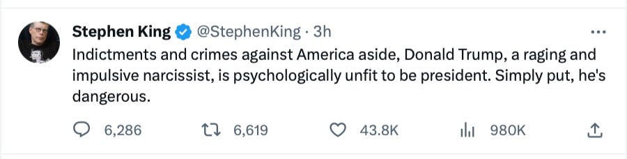 Stephen King perched upon the millions he made from writing about the very class of people who voted for Trump, loves to take any opportunity to remind them of their place in the American hierarchy. They have no power in a country ruled by an oligarchy of a new Gilded Age.