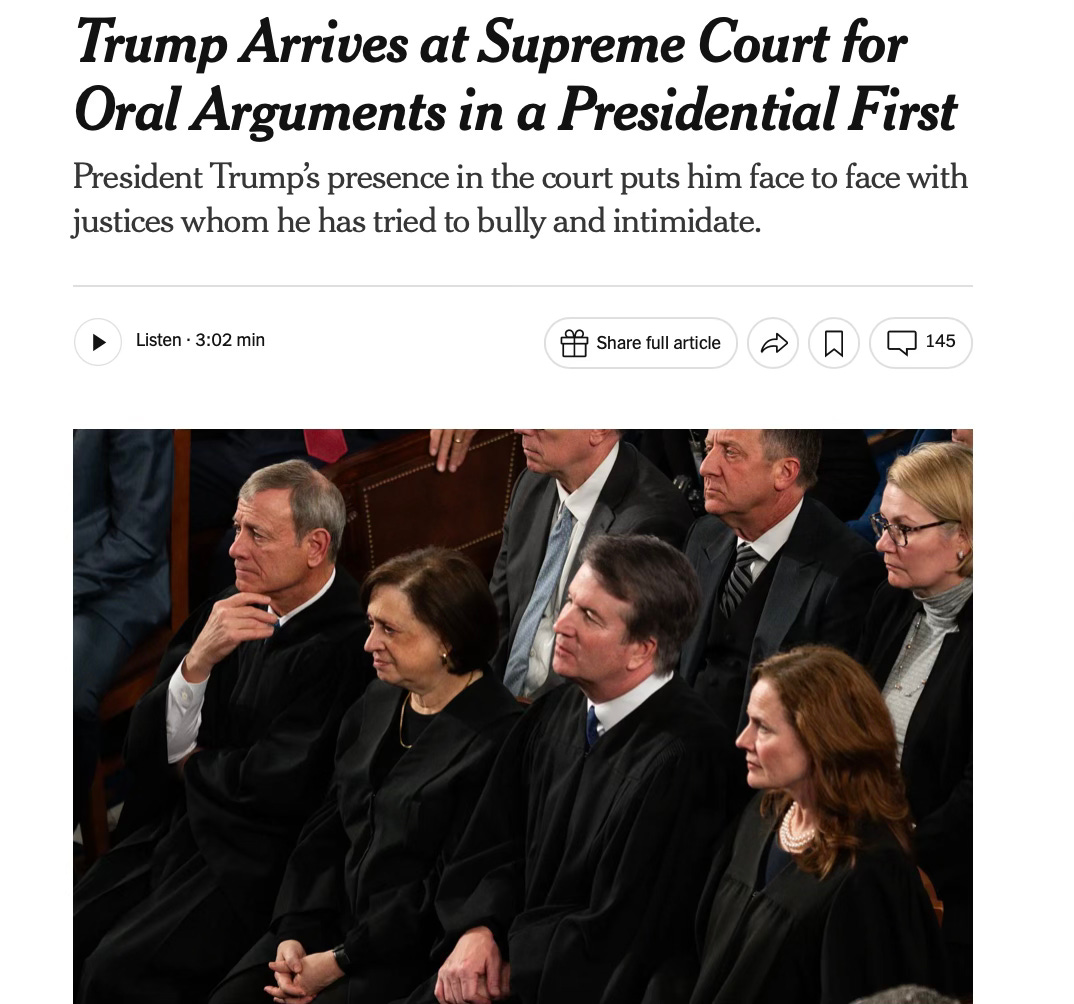 I guess that’s one way to look at it, that Trump is there to intimidate them. Somehow, I don’t think it would quite go that way. These justices aren’t easily intimidated, for one thing, and it’s more likely they’d be annoyed and vote against Trump. My own thought is that he’s genuinely interested in watching and hearing the arguments, but perhaps I’m just being naive.