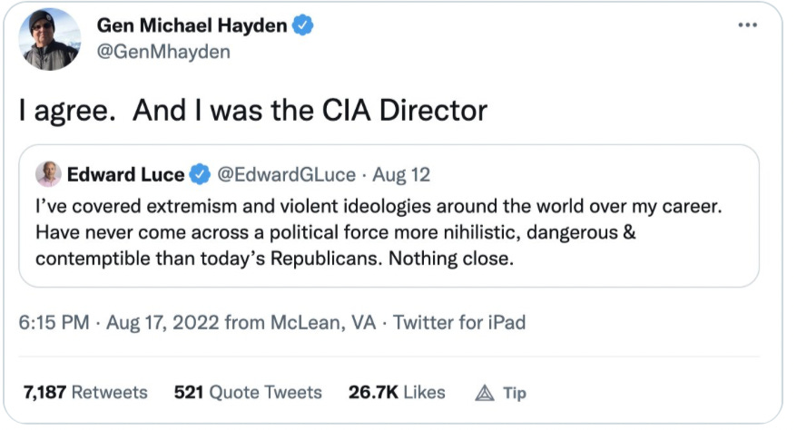 They have become furious that the rest of the country sees through these naked emperors. Note Merrick Garland’s sanctimonious defense of the supposed professionalism of the Justice Department and FBI hierarchies—while even as he pontificated, they were in the very process of leaking and planting sensational “nuclear secrets” narratives to an obsequious media to justify the indefensible political fishing expedition at a former president’s home and current electoral rival to Merrick Garland’s boss.