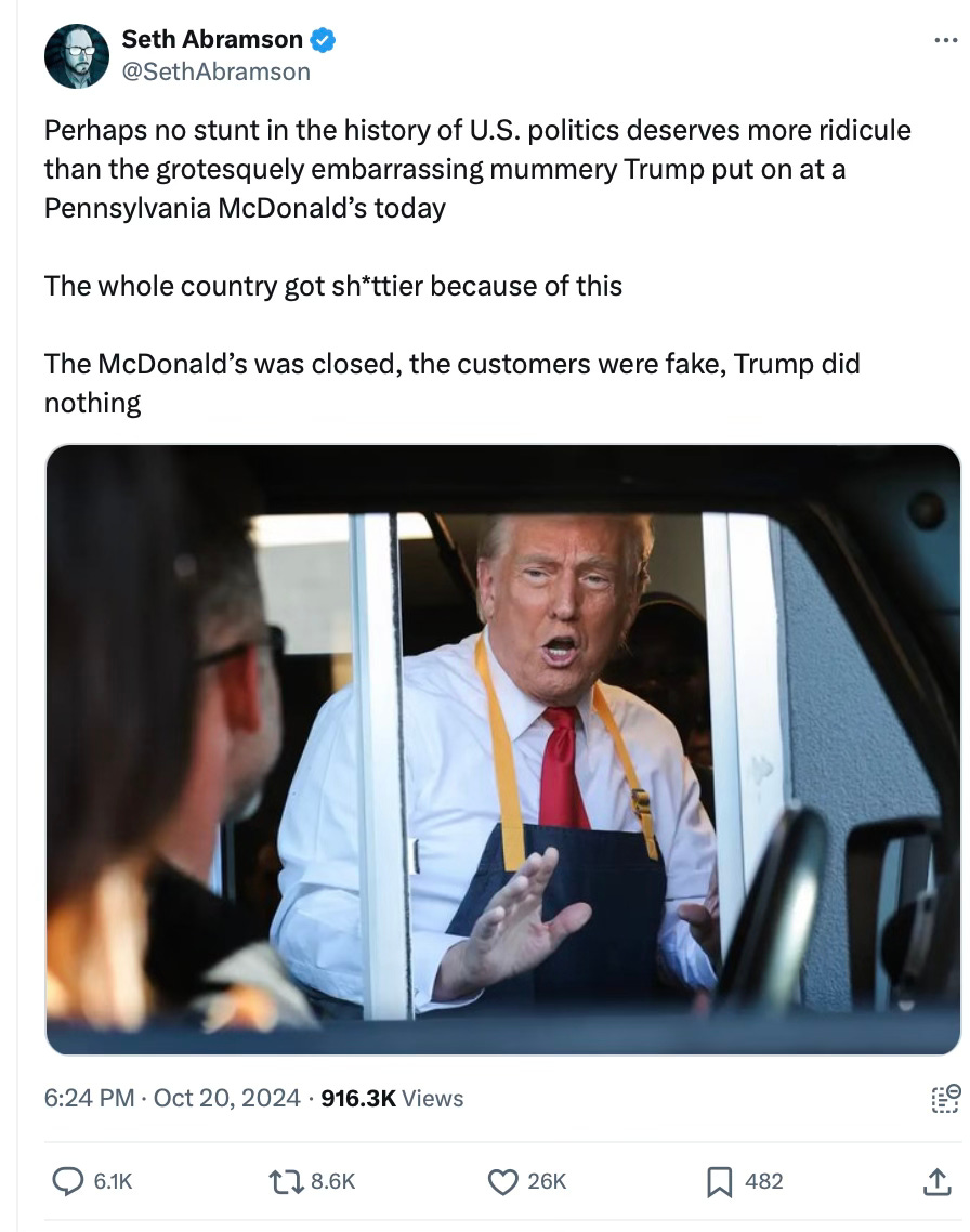 It shouldn’t be that surprising that now, they’re trying to turn Trump’s trolling of Kamala Harris and whether or not she ever worked at McDonald’s into another birther type of story. And the cycle begins anew. Don’t vote for the racist, they will say.