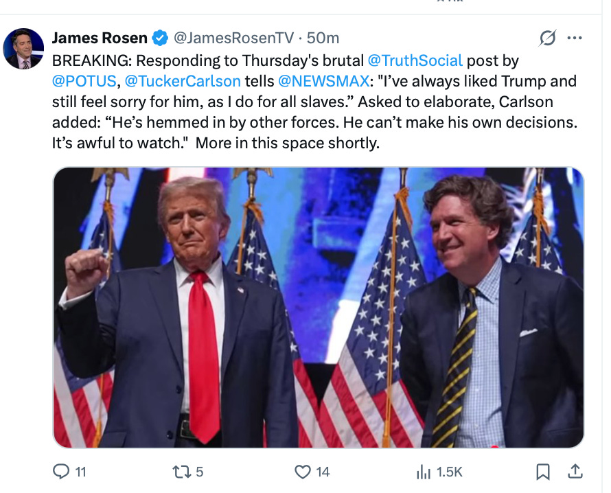 If you’ve followed Tucker a long time, as I have, you know he often plays this card, the one where he “feels sorry” for a politician or leader. He’s pulling out his sharpest tools to stab back the hardest.