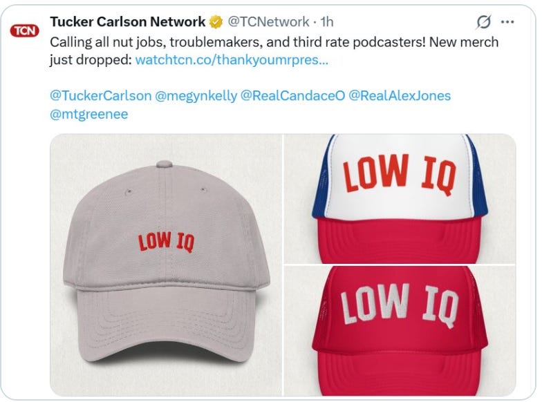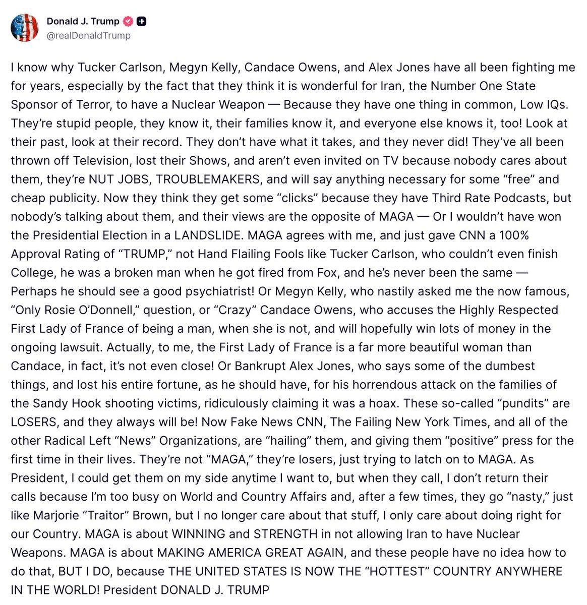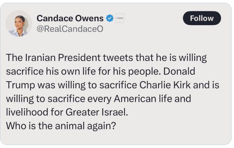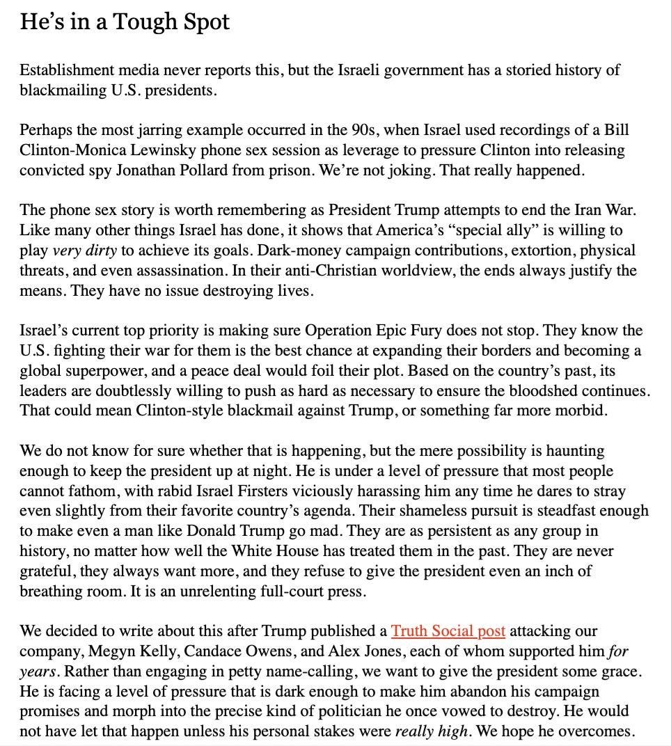 Trump called out the loudest among them, or at least those making headlines in mainstream news as they amplify the rift - Tucker, Megyn, Candace, Marjorie “Traitor” Brown and Alex Jones. He didn’t go after Piers Morgan, Dave Smith, Joe Rogan, Ana Kasparian or any number of influencers or podcasters who have been criticizing the war in Iran and saying Trump betrayed his base by getting America involved in a way “no one wants.”