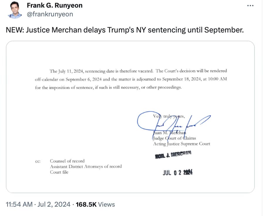 Judge Juan Merchan delayed former President Donald Trump’s sentencing to September.