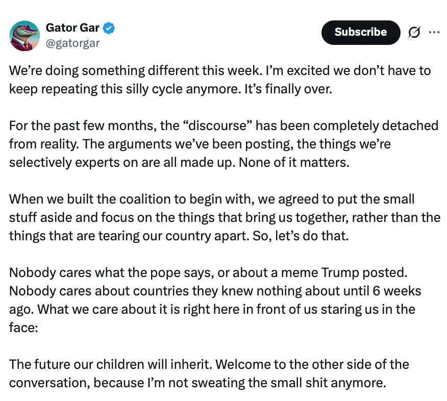 I don’t know if he will delete it. Maybe he will. Maybe he’ll apologize. But here’s the thing. To apologize, he would have to admit intent. I know this game well. When I posted a joke about “White Dudes for Harris” and said “white power,” it whipped around X and was seen by thousands of people. Two of my friends called me on the phone and said, “Did you mean to celebrate white supremacy?” It was surreal.