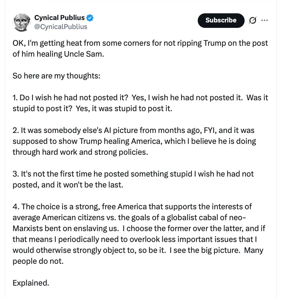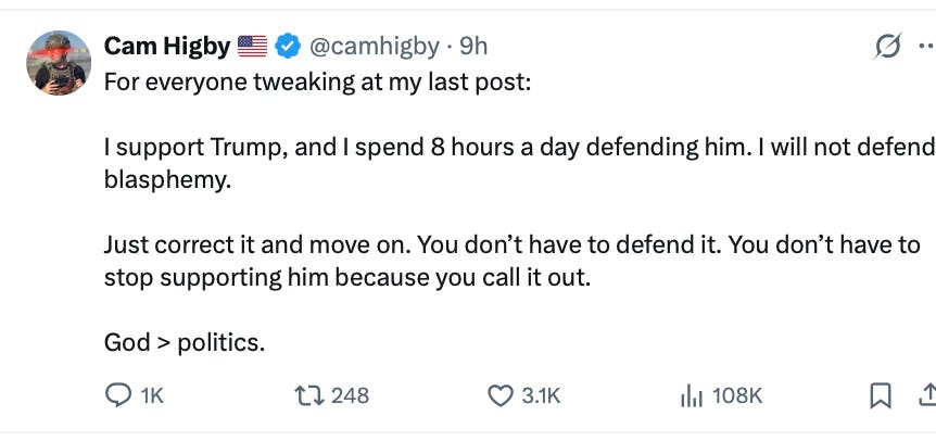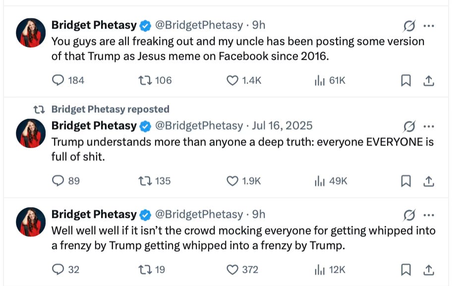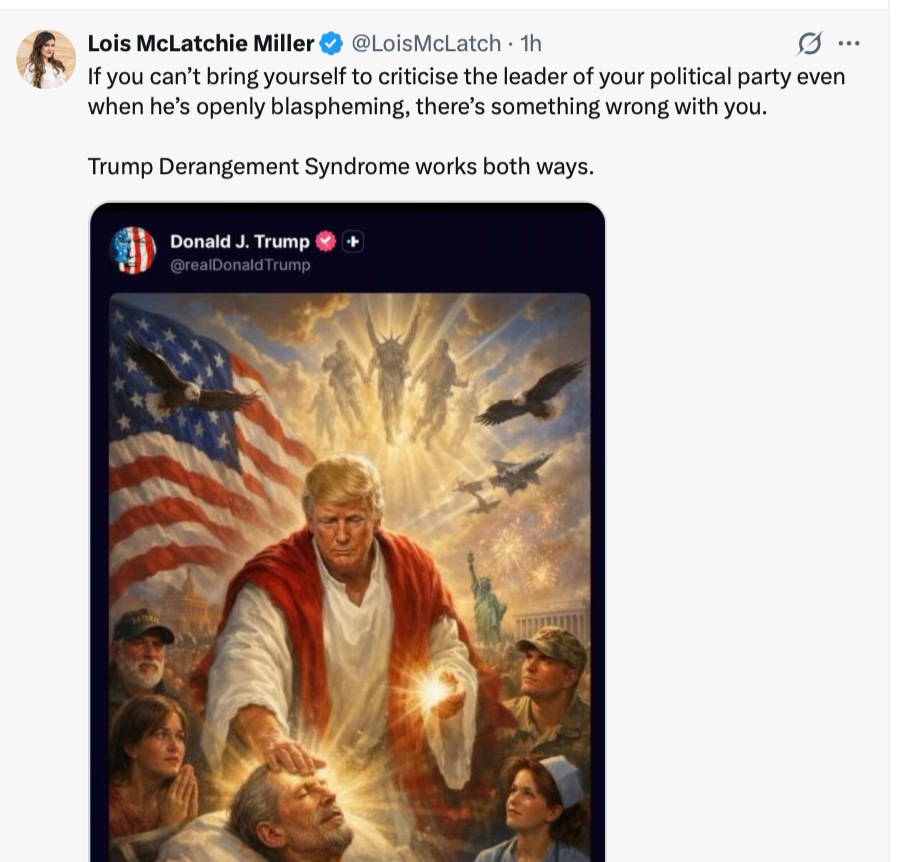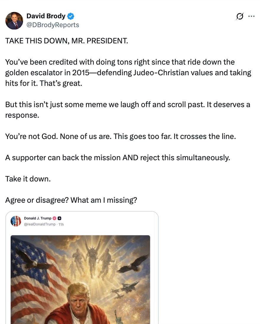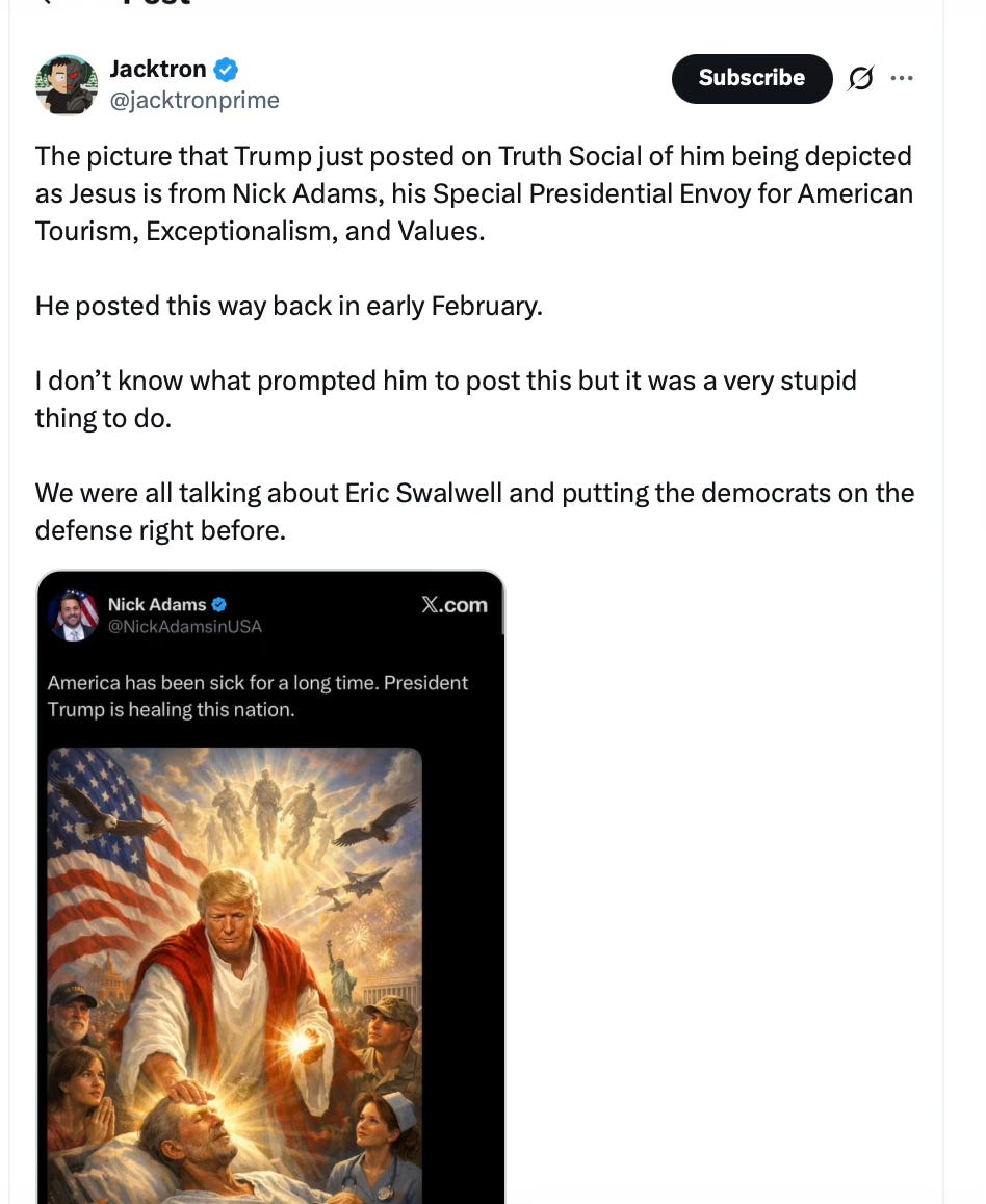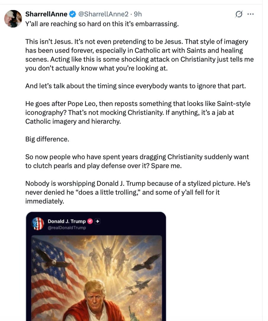 Did Trump post it to be offensive and mock God? Of course not. Marjorie Traitor Brown is now calling him the “antichrist,” along with Sneako, Milo, and the usual suspects of the Woke Right.