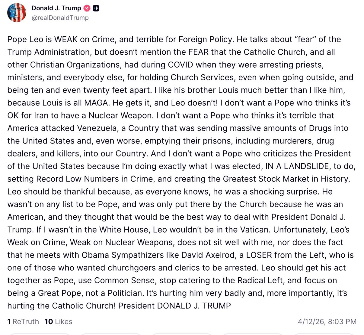 The meme comes on the heels of Trump posting a rant against Pope Leo: