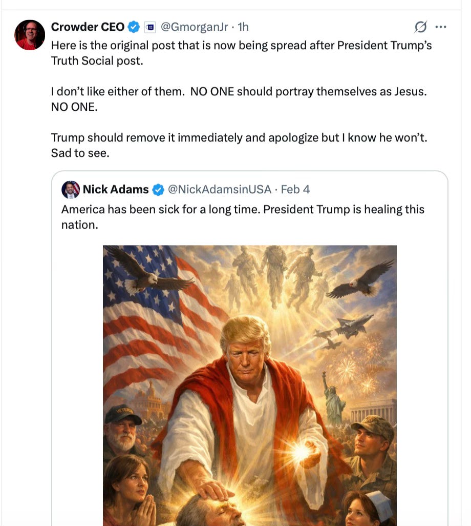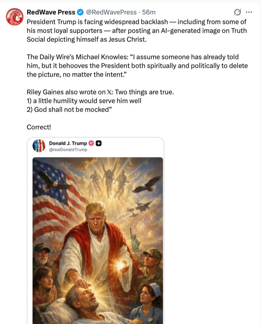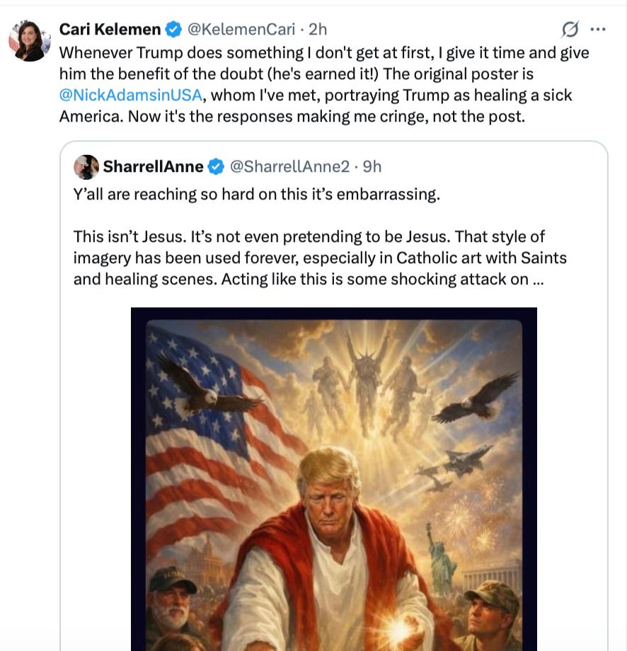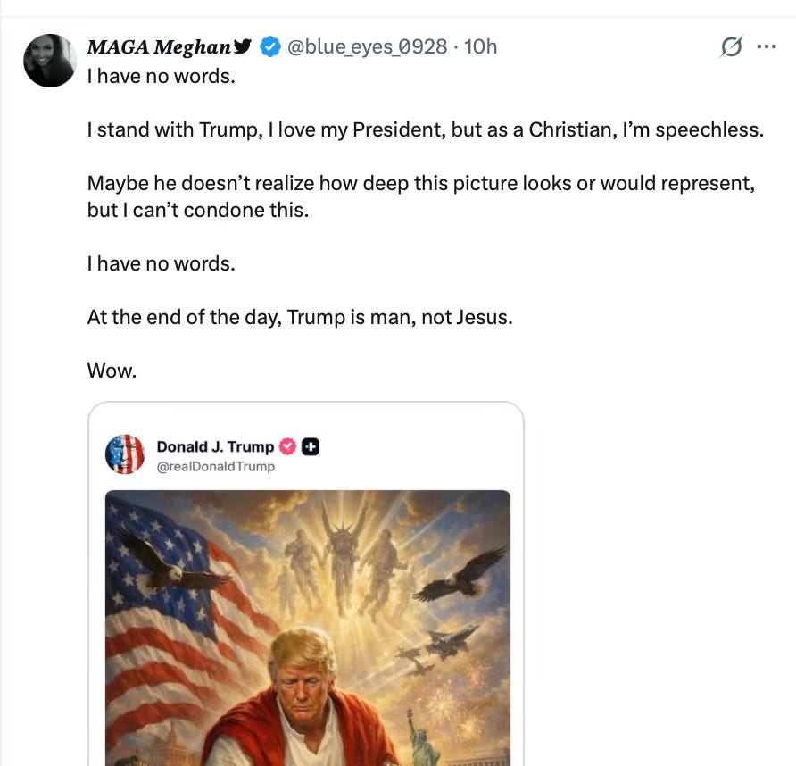 So we might disagree a little on this. I do not believe Trump posted this, “depicting himself as Jesus Christ.” I think he saw it, liked it, and posted it, not realizing that it would be considered blasphemy. He is not now nor has he ever been a devout Christian. His base is, or a large part of it is. He himself might not have realized it was blasphemous and would create a firestorm.